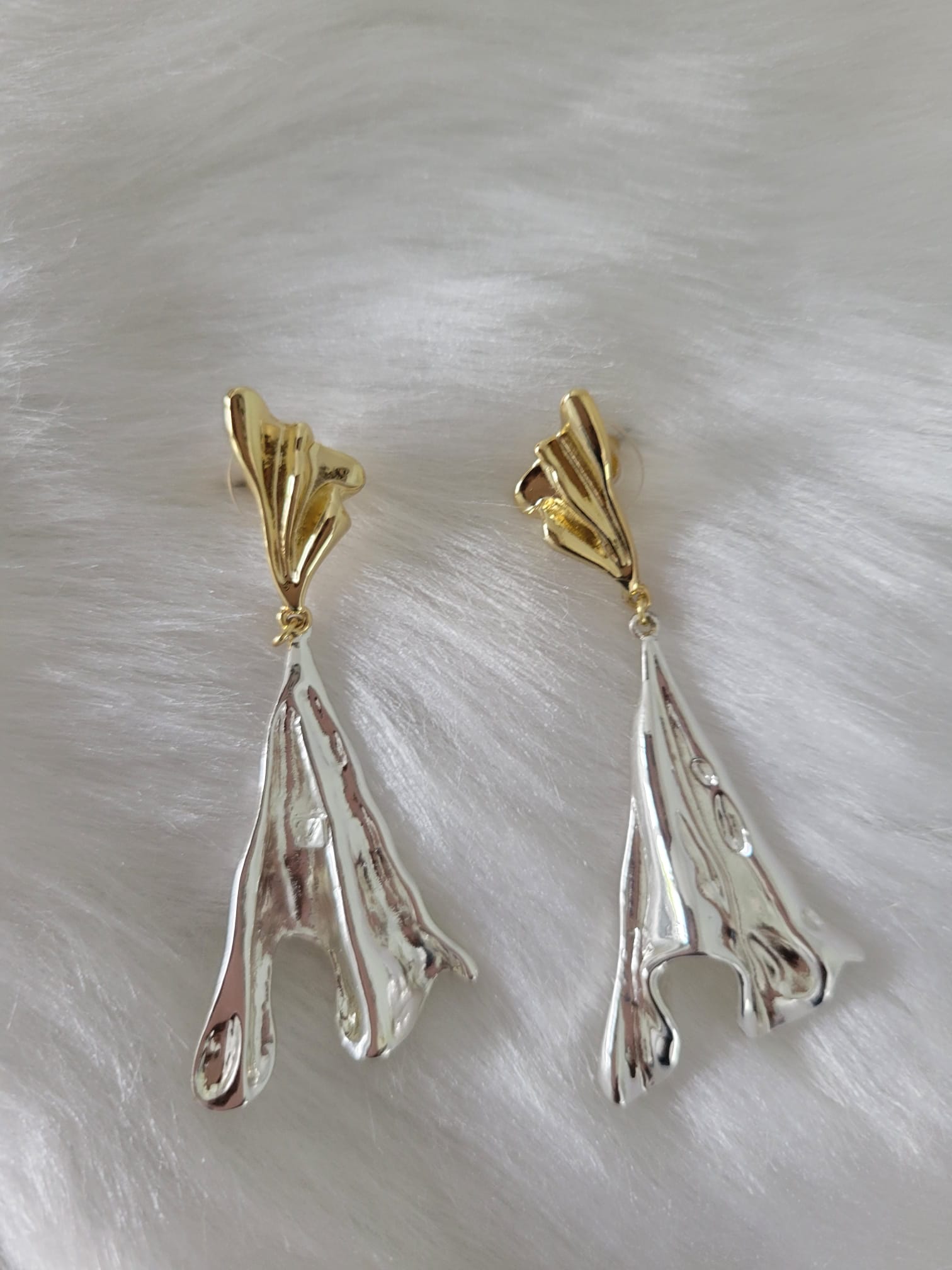 The Ethereal Fusion Drop Earrings are a captivating blend of elegance and modern design. These earrings feature a unique combination of gold and silver, creating a striking contrast that enhances their overall allure. The design is both intricate and fluid, with the gold and silver elements intertwining gracefully to form a distinctive and eye-catching shape. This harmonious fusion of metals adds a touch of sophistication and contemporary style to the earrings.