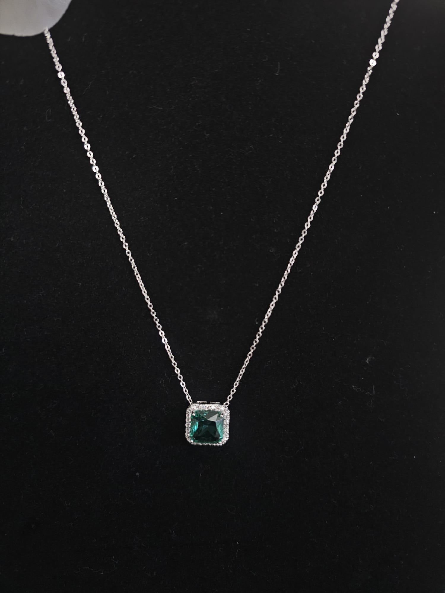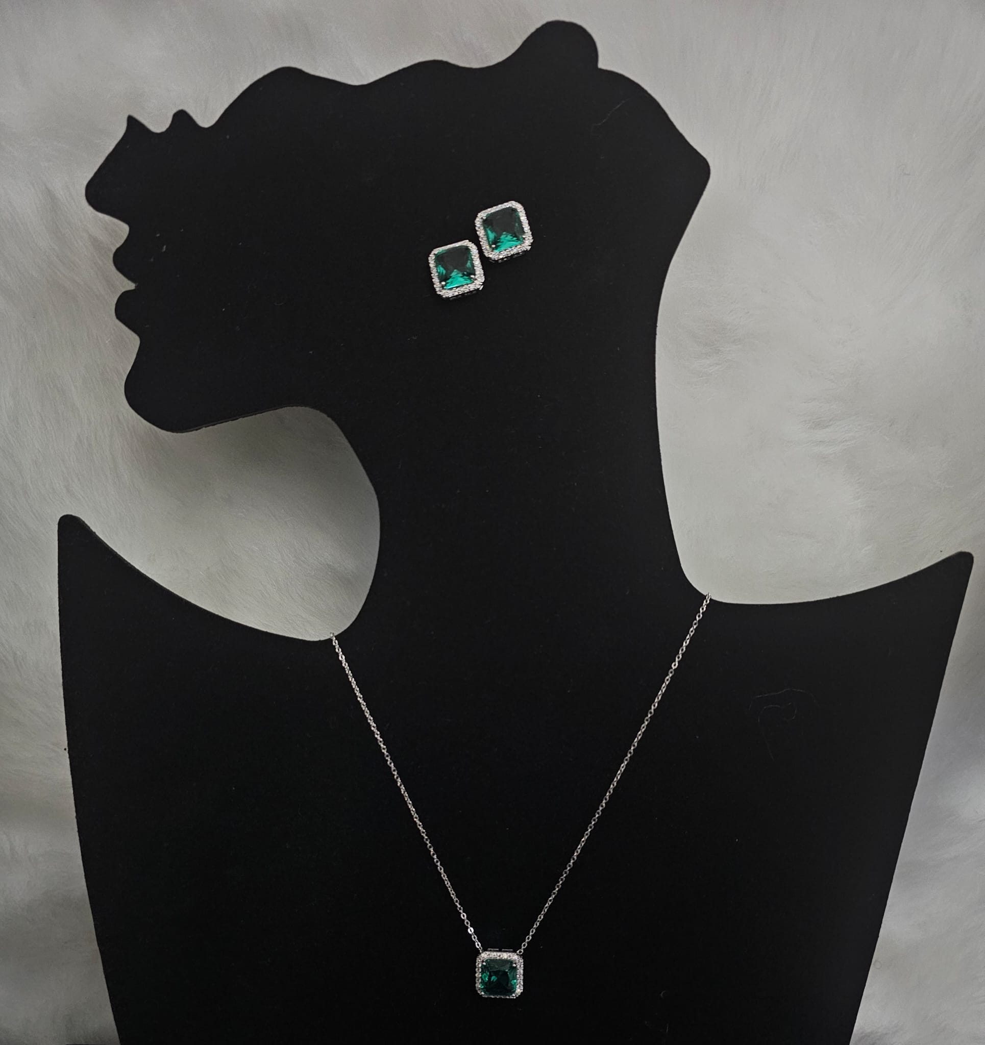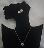 The necklace boasts a captivating pendant featuring a large, vibrant fake gem at its center. This central gem is surrounded by a halo of shimmering faux diamonds, creating a radiant and eye-catching effect. The pendant is elegantly suspended from a sleek stainless steel chain that enhances its brilliance while ensuring durability and comfort.The matching earrings are designed to complement the necklace perfectly. Each earring features a similar design, with a prominent fake gem encircled by faux diamonds. The earrings are crafted with attention to detail, ensuring that they catch the light beautifully and add a touch of glamour to any look. The secure and comfortable backs make them ideal for all-day wear.
