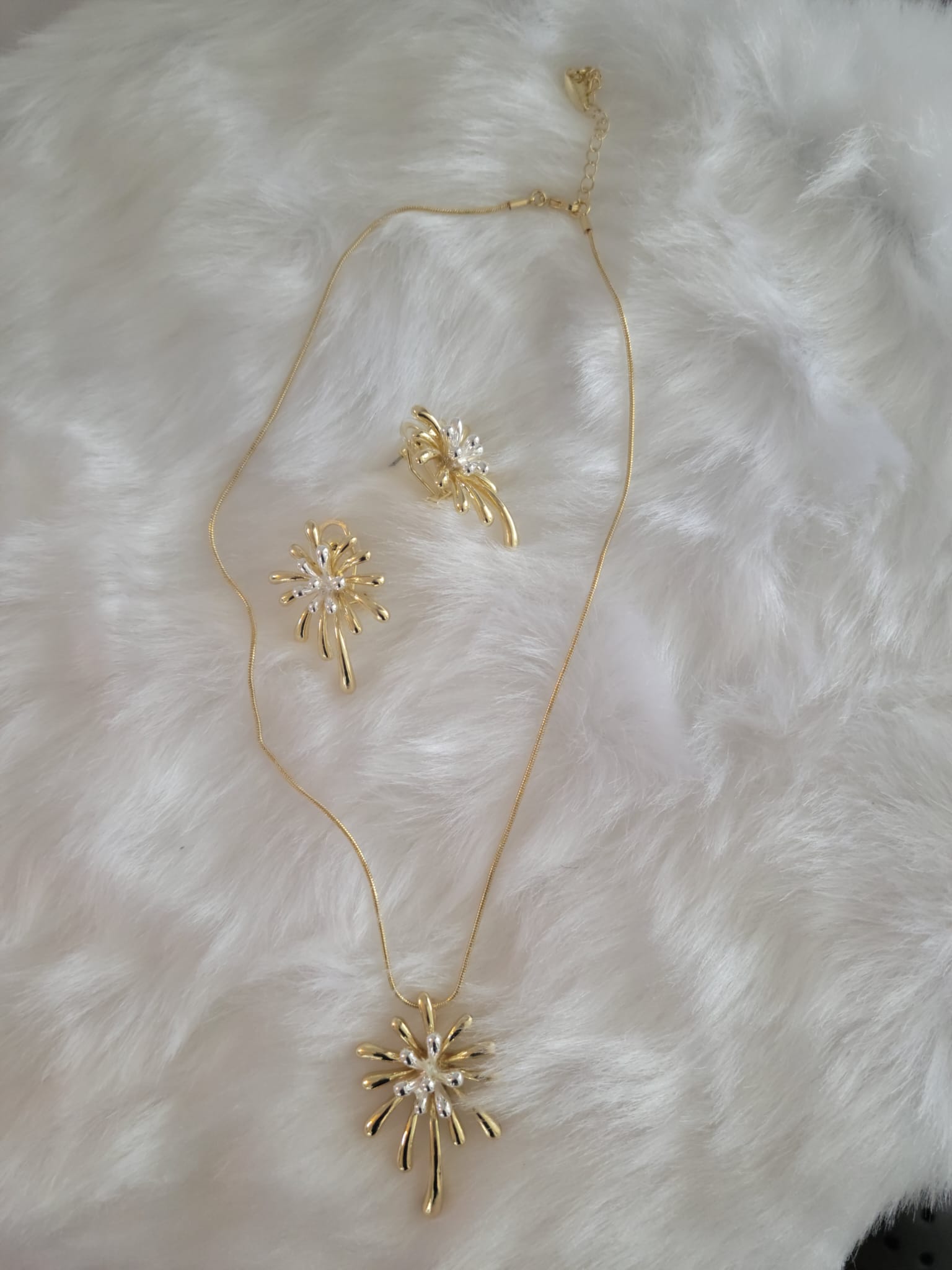 The Explosion of Elegance Set is a bold and sophisticated jewelry collection that captures the dramatic essence of an explosion with a refined touch. Crafted from gold-plated stainless steel, this set includes a necklace and matching earrings, each designed to reflect a dynamic burst of style. The Explosion of Elegance Set is perfect for those who appreciate bold, statement-making jewelry with a touch of elegance. Its unique design and contrasting finishes make it a standout choice for special occasions or adding a dramatic touch to everyday wear.