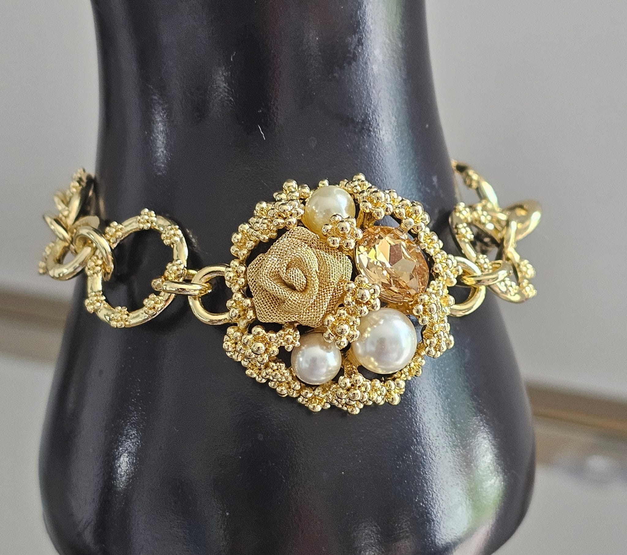 At the center of the bracelet, a standout element captures attention: the top half of a sphere, intricately covered with tiny, detailed flowers, serves as a stunning focal point. This spherical element is beautifully complemented by a single, prominent gold rose, which adds a touch of romantic sophistication.