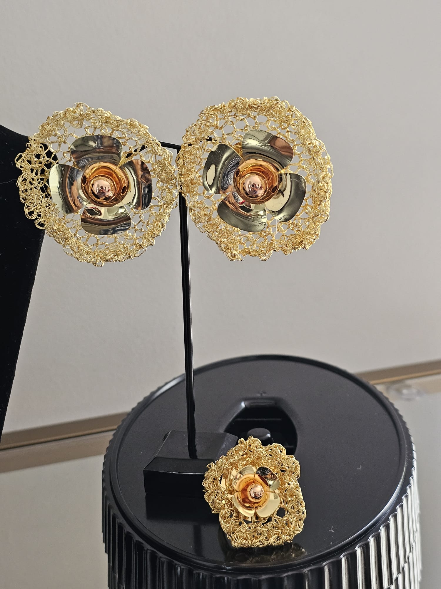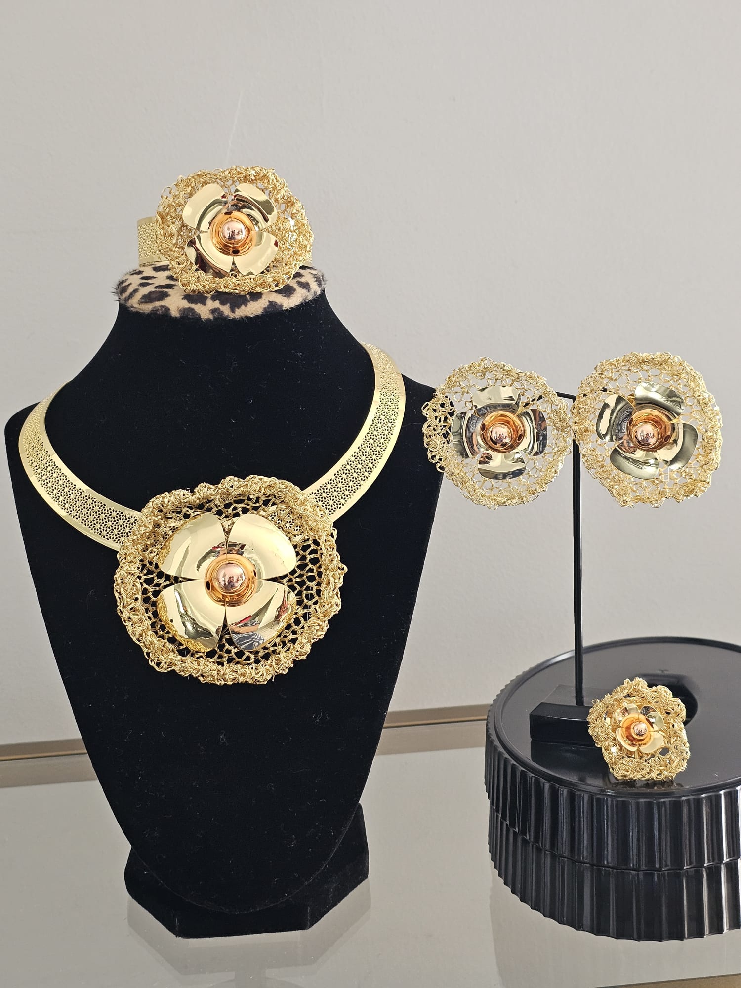 The Floral Mesh Radiance Collection is an exquisite four-piece jewelry set crafted with gold-plated stainless steel, featuring a harmonious blend of delicate floral designs set against a sophisticated mesh backdrop. This set includes a necklace, earrings, ring, and bracelet. Ring fits all sizes.