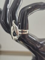 The “Silver Infinity Ring” is a beautifully crafted piece that combines elegance with a modern design. The ring features a smooth, polished finish and is made of a shiny, silver-colored metal. Its open-ended design, with a small gap where the band does not form a complete circle. The ends of the ring are rounded and slightly turned outward, giving it an elegant and contemporary look.