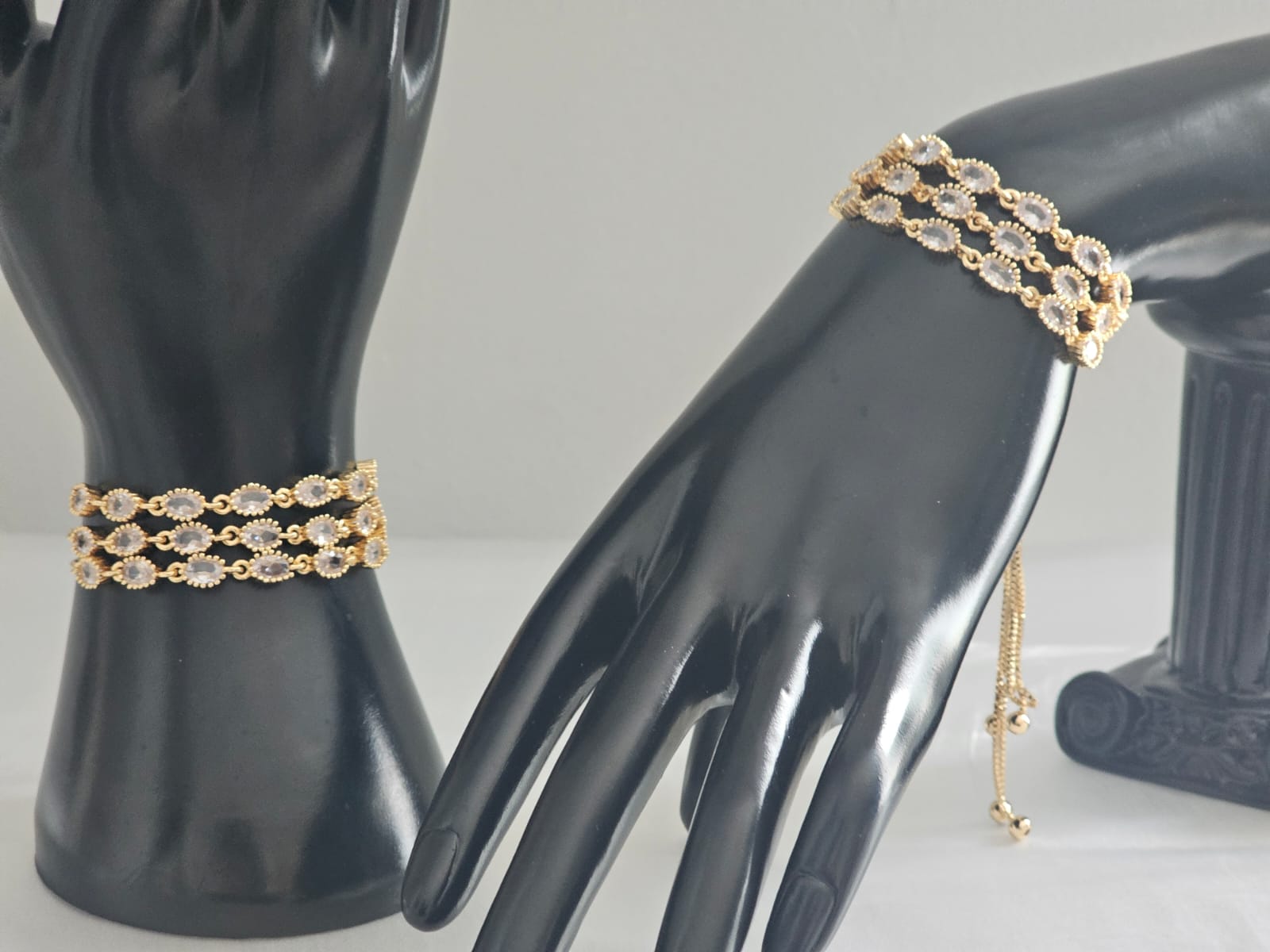 The Gilded Sparkle Trio exudes timeless elegance with its gold-plated stainless steel construction and dazzling faux diamonds. The adjustable strings provide a customizable fit, while the identical design of the bracelets allows for versatile styling. Whether worn alone for a subtle touch of glamour or stacked together for a more dramatic effect, this trio adds a refined and sophisticated touch to any outfit.