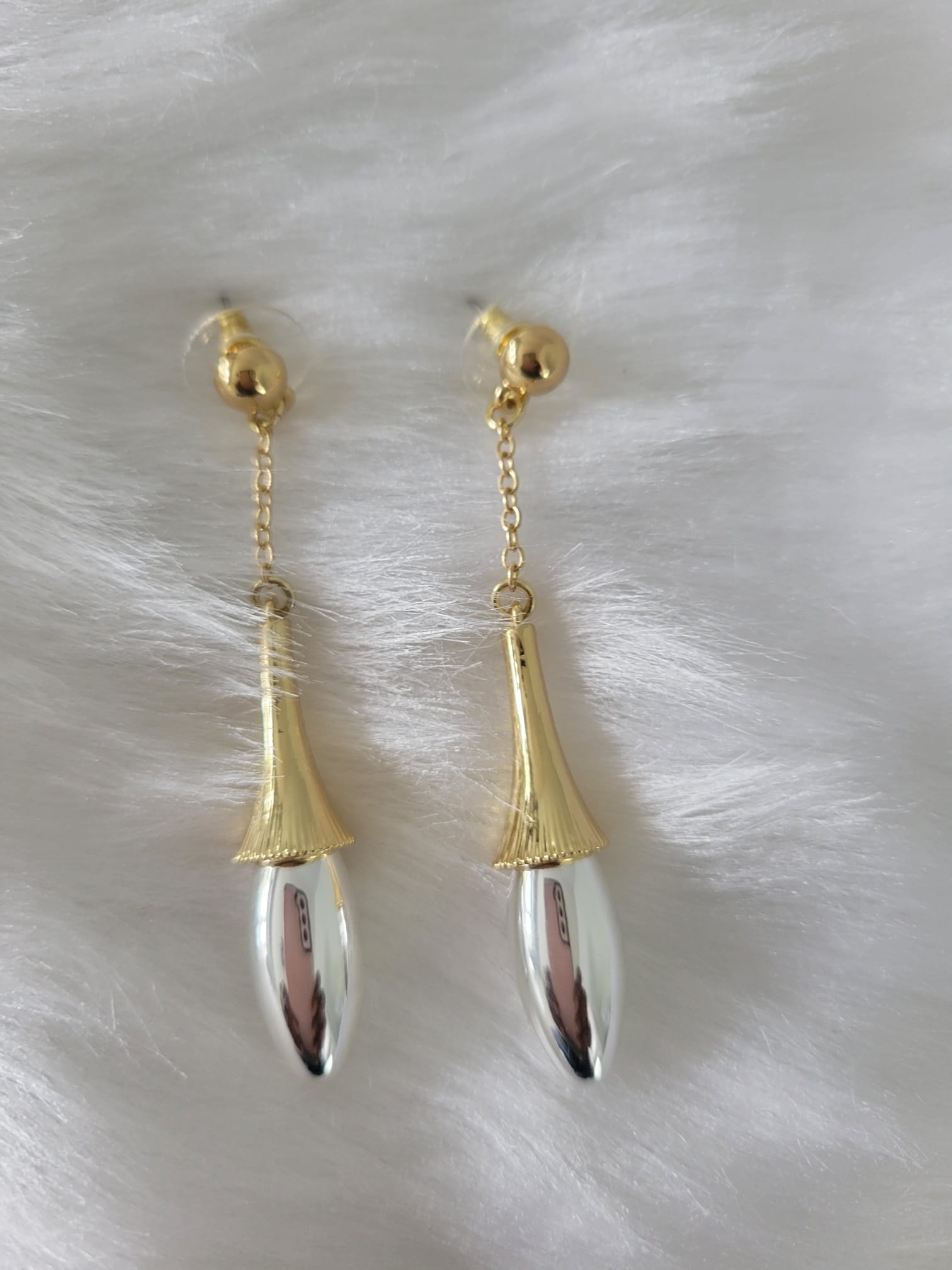 Suspended from the golden top is a silver teardrop, polished to a mirror-like finish. The teardrop dangles gracefully, catching the light with every movement and adding a touch of fluidity to the design. The contrast between the gold and silver creates a striking visual effect, making Golden Dewdrop a versatile accessory that can complement both formal and casual outfits.