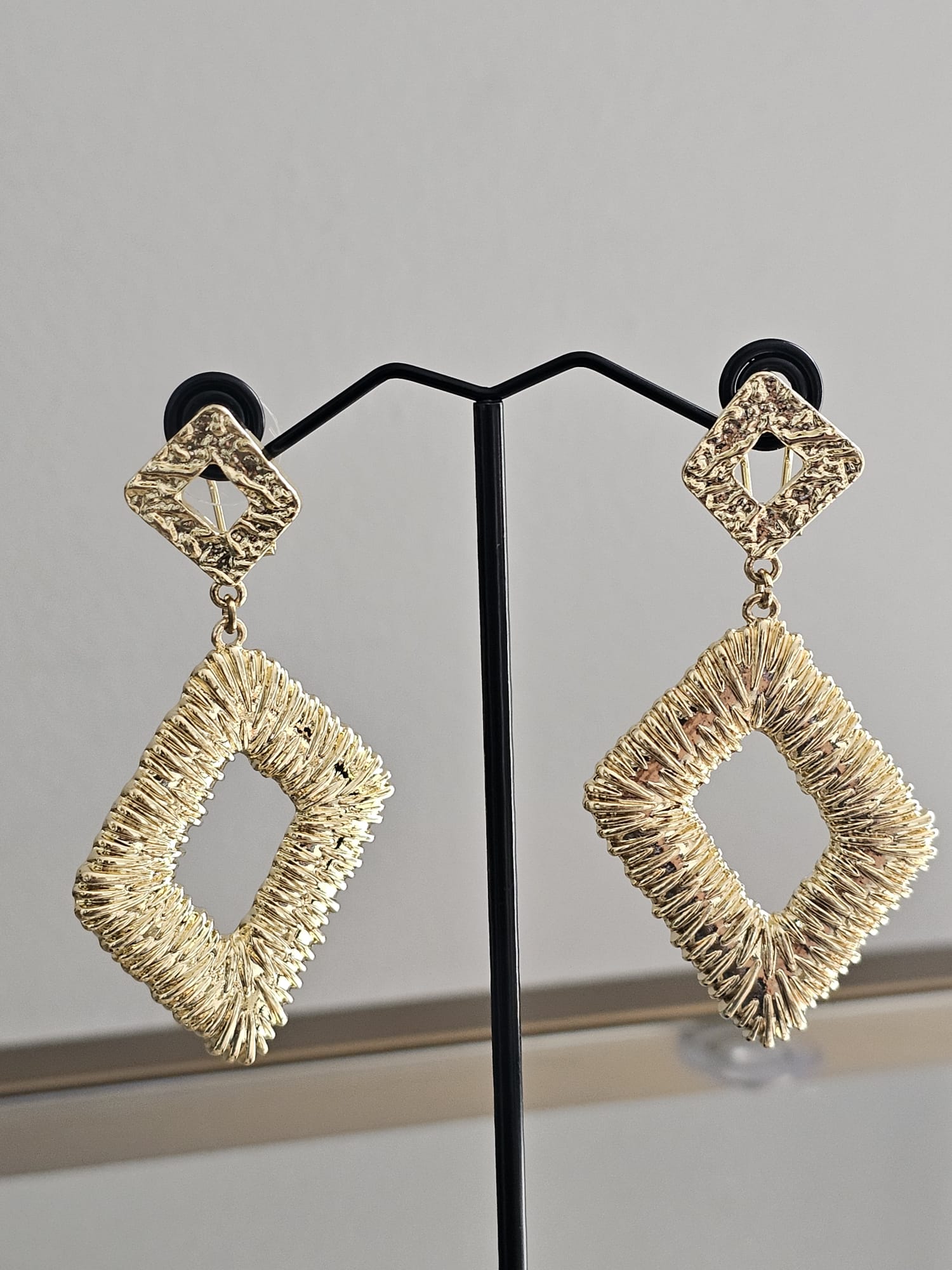 In addition to their stunning appearance, the Golden Geometric Cascade Earrings are designed with comfort in mind. They are lightweight and hypoallergenic, making them suitable for sensitive ears. The secure fastening ensures that they stay in place, providing peace of mind throughout the day. These earrings are not just a fashion statement but also a testament to the beauty of modern design, captured in a timeless and elegant form. With their intricate texture and shimmering gold finish, the Golden Geometric Cascade Earrings are sure to become a cherished accessory for any jewelry lover.