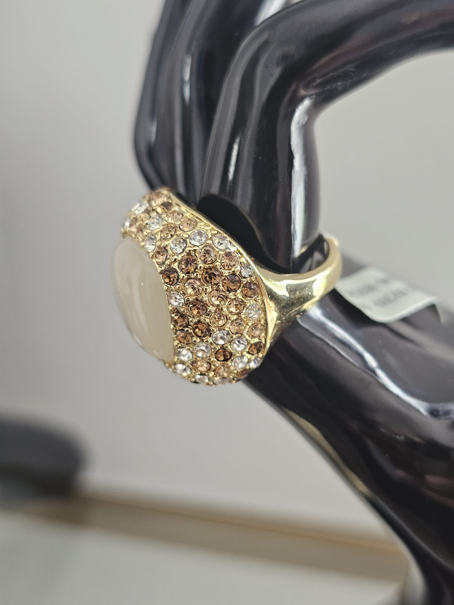 The “Golden Halo Ring” is a beautifully crafted piece that combines elegance with a striking design. The ring features a large, central, bezel-set stone with a milky white hue, surrounded by a halo of smaller, round-cut clear stones. This combination creates a stunning contrast and adds a touch of sparkle to the overall design.