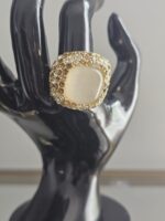 The central stone’s opaque, milky white color adds a unique and elegant touch, while the surrounding clear stones enhance the ring’s overall brilliance. Whether you’re dressing up for a special event or adding a touch of sophistication to your everyday look, the Golden Halo Ring is sure to make a statement with its detailed craftsmanship and luxurious appeal.