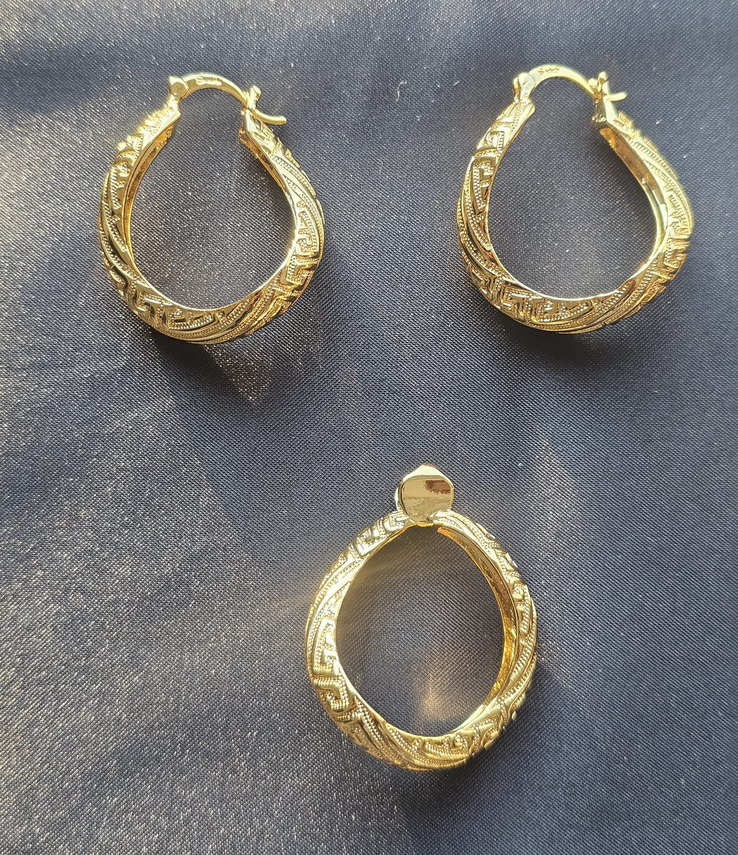 Introducing the Golden Elegance Earring and Pendant Set, a stunning combination of earrings and a pendant that exudes timeless sophistication and modern charm.