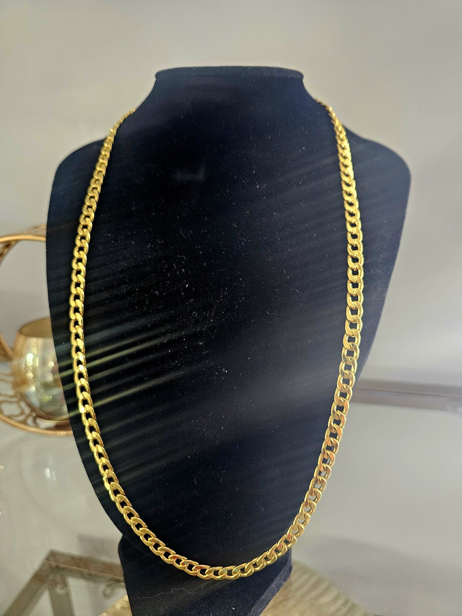 The Golden Horizon Necklace is a strikingly simple yet bold gold-plated necklace, designed for those who appreciate classic elegance with a contemporary twist. At a generous 25 inches in length, this necklace sits gracefully at the mid-chest, offering a perfect balance of sophistication and statement. The thick, rounded links are meticulously crafted to catch the light from every angle, creating a rich, radiant glow that enhances any look without overwhelming it. Each link is slightly polished to perfection, lending the necklace a substantial feel while maintaining an overall sleek and refined aesthetic.