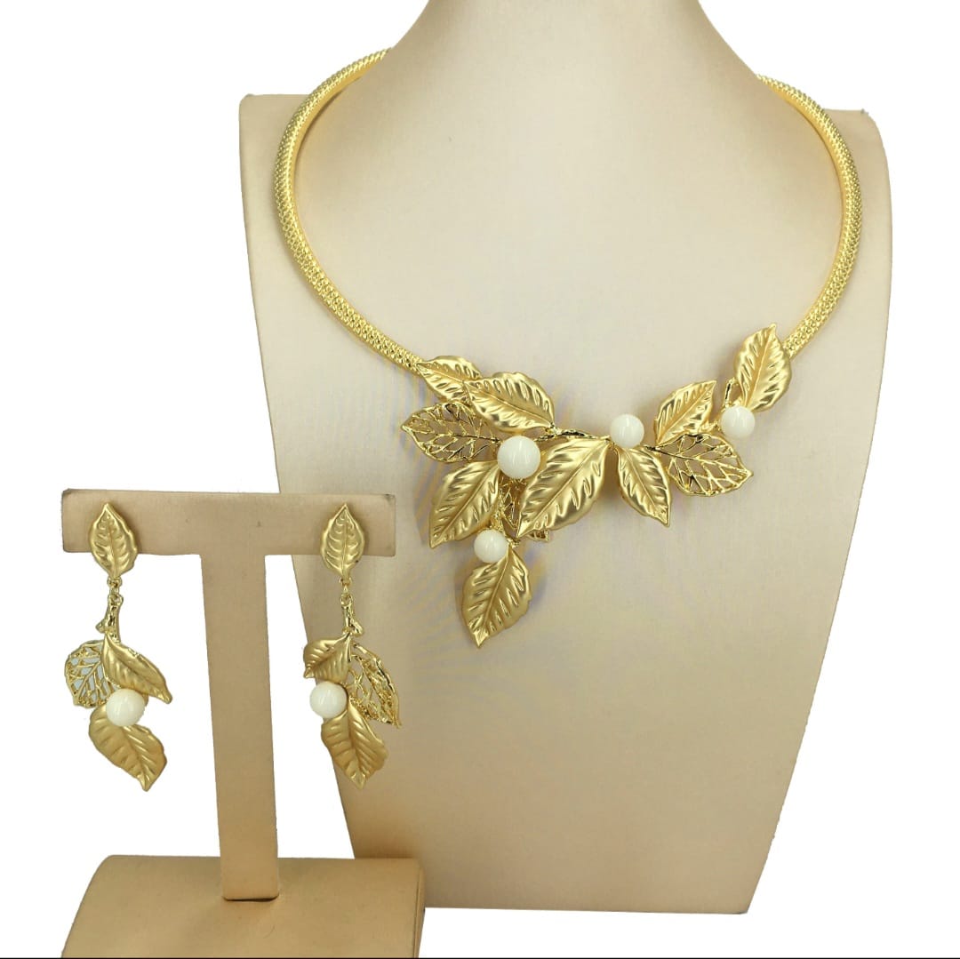 The Golden Leaf Radiance is a stunning two-piece jewelry set made from gold-plated stainless steel, featuring an elegant design that combines golden leaves with pristine white balls. This set includes earrings and a necklace, each crafted to exude a sophisticated and radiant charm.  The jewelry is made from durable stainless steel, known for its strength and resistance to tarnishing. The stainless steel is coated with a luxurious gold plating, providing a warm and opulent finish that enhances the overall elegance of the pieces. The design highlights golden leaves and white balls, creating a refined and harmonious look. The combination of the rich gold and the pristine white adds a touch of contrast and sophistication to the set.