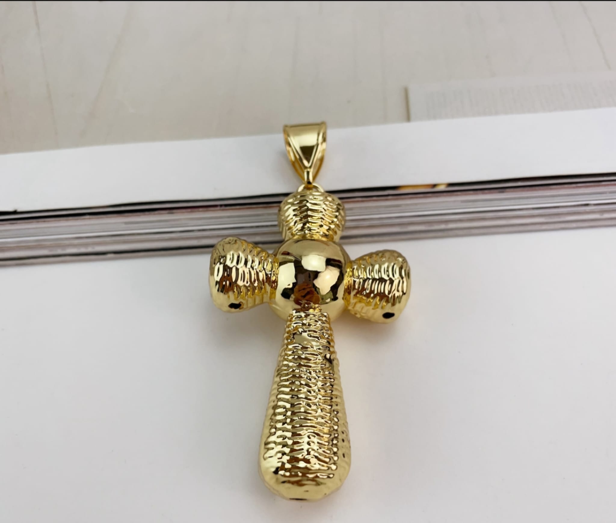 The Golden Mosaic Cross is a striking pendant crafted from high-quality, gold-plated, non-tarnish material. This pendant features a distinctive cross design with each arm adorned with raised, diamond-shaped patterns, creating a mosaic-like texture. The central part of the cross is smoother and slightly bulbous, providing a beautiful contrast to the textured arms. The pendant is completed with a polished, tapered bail, making it easy to thread through a chain.