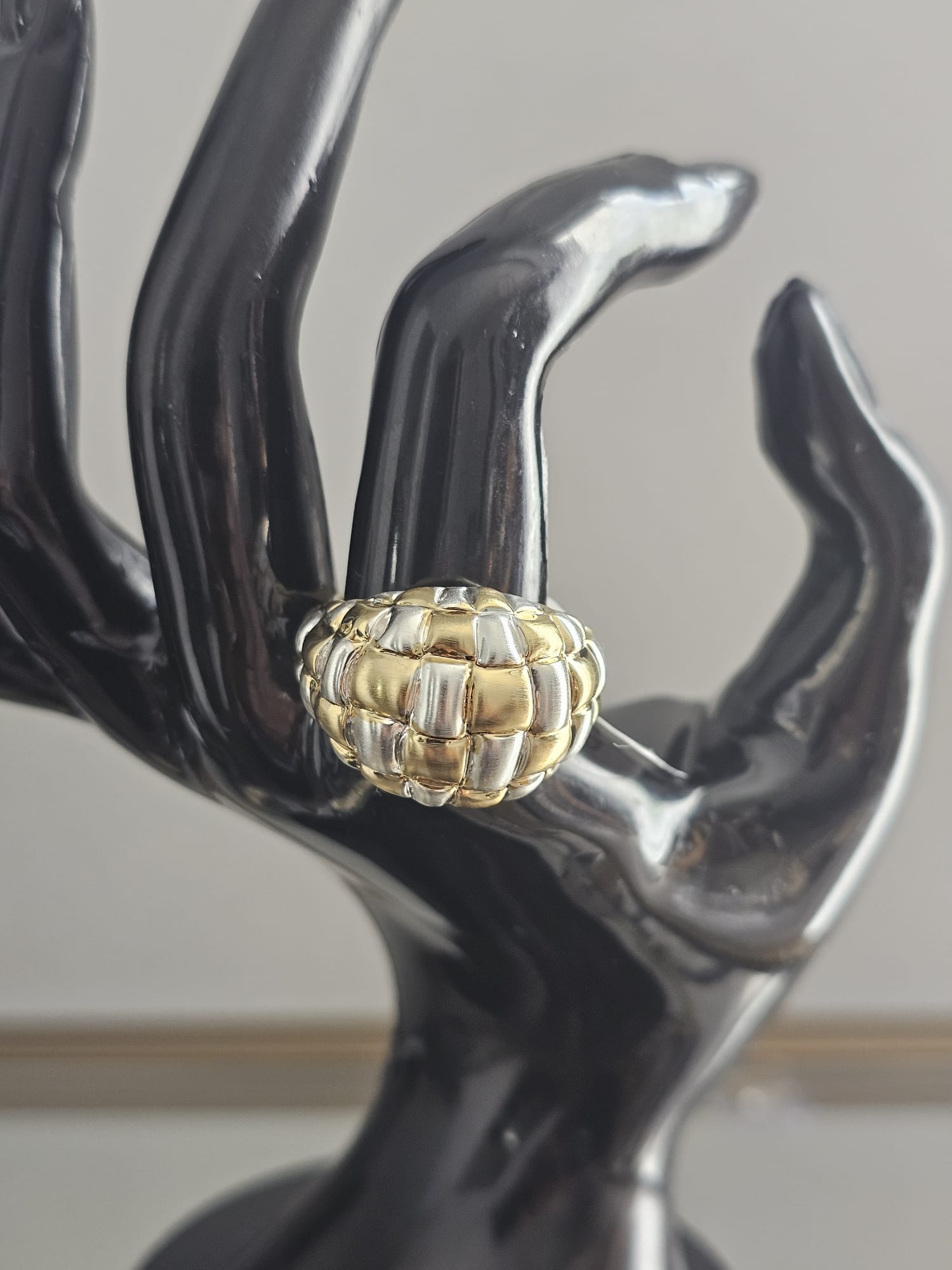 The intricate design of the ring adds depth and character, making it a versatile piece that can complement various outfits and occasions. Whether you’re dressing up for a special event or adding a touch of sophistication to your everyday look, the Golden Mosaic Ring is sure to make a statement with its detailed craftsmanship and luxurious appeal.