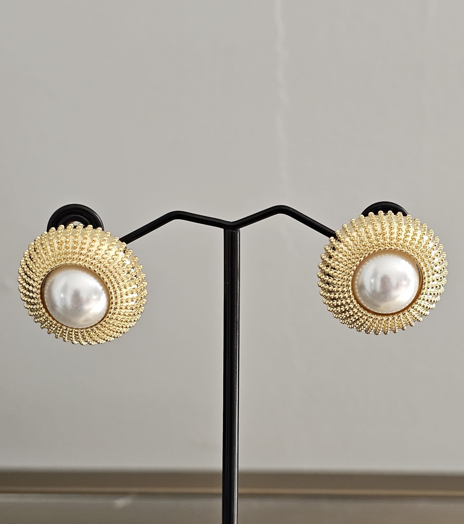 The Golden Pearl Oasis Earrings are a stunning blend of classic elegance and modern design. Each earring features a round, textured gold disc that captures the light beautifully, creating a shimmering effect. At the center of the disc lies a lustrous pearl, adding a touch of sophistication and timeless beauty to the piece. Crafted from non-tarnish gold-plated material, these earrings are designed to maintain their radiant shine and luxurious appearance over time.