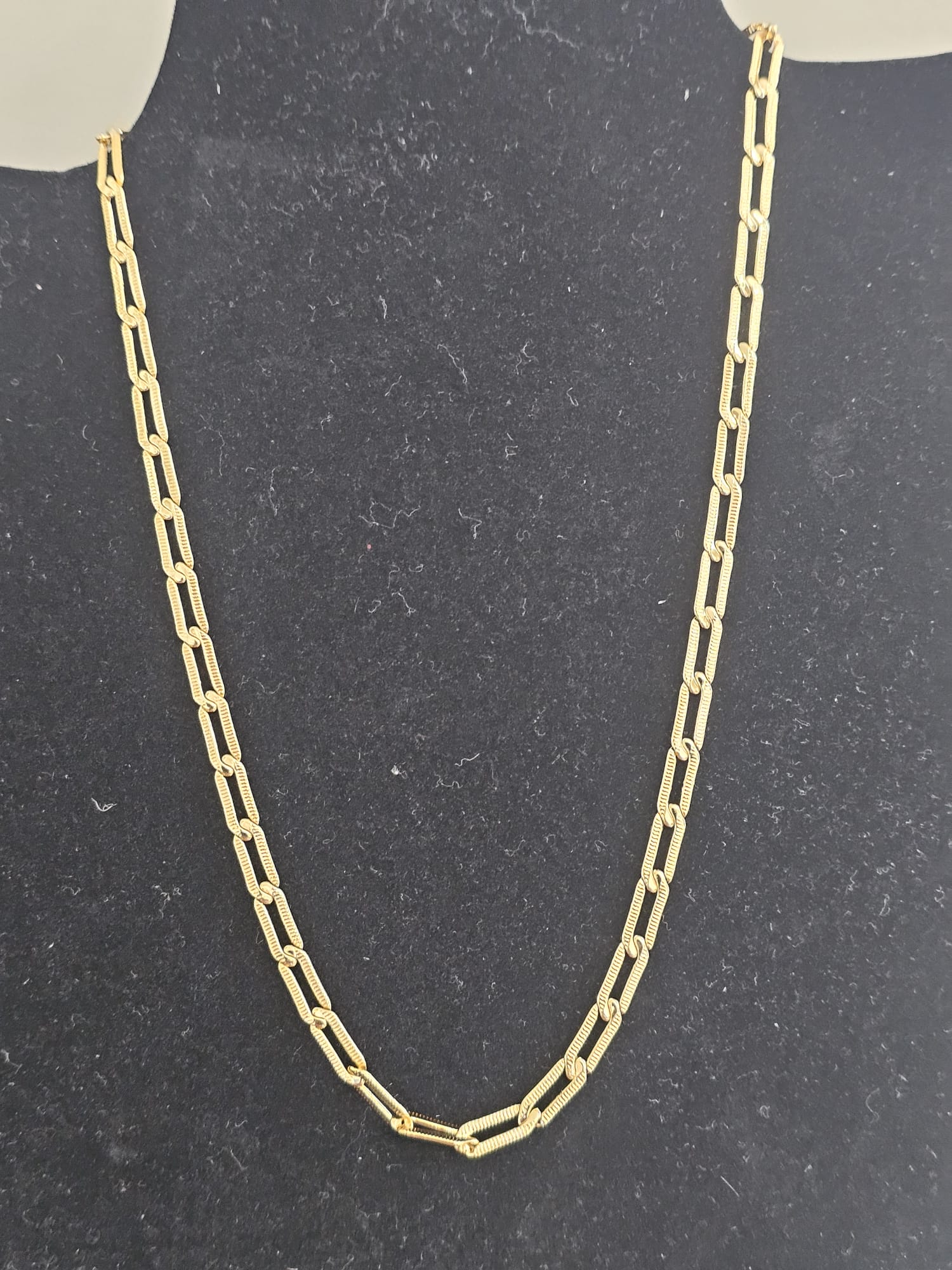 Introducing the “Golden Luxe Chain Necklace”, a stunning piece that combines elegance with durability. This necklace features a gold-plated, non-tarnish design, ensuring it maintains its brilliant shine and luxurious appearance over time. The chain is 18 inches long, making it a perfect length to complement various necklines and styles.