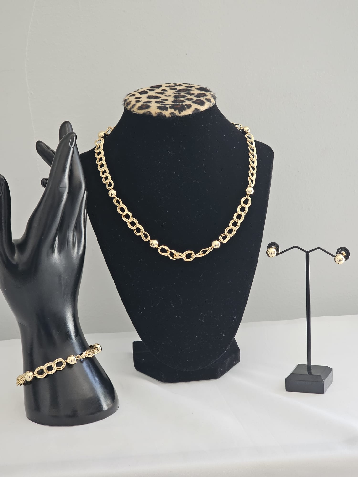 Bracelet: The Golden Sphere Bracelet perfectly complements the necklace with its refined design. Made from the same gold-plated stainless steel, it features a series of spherical elements mixed with smooth chain segments. The spheres mirror the necklace’s design, providing a cohesive and polished look. The bracelet’s adjustable clasp ensures a comfortable fit, making it an ideal accessory to complete the ensemble.