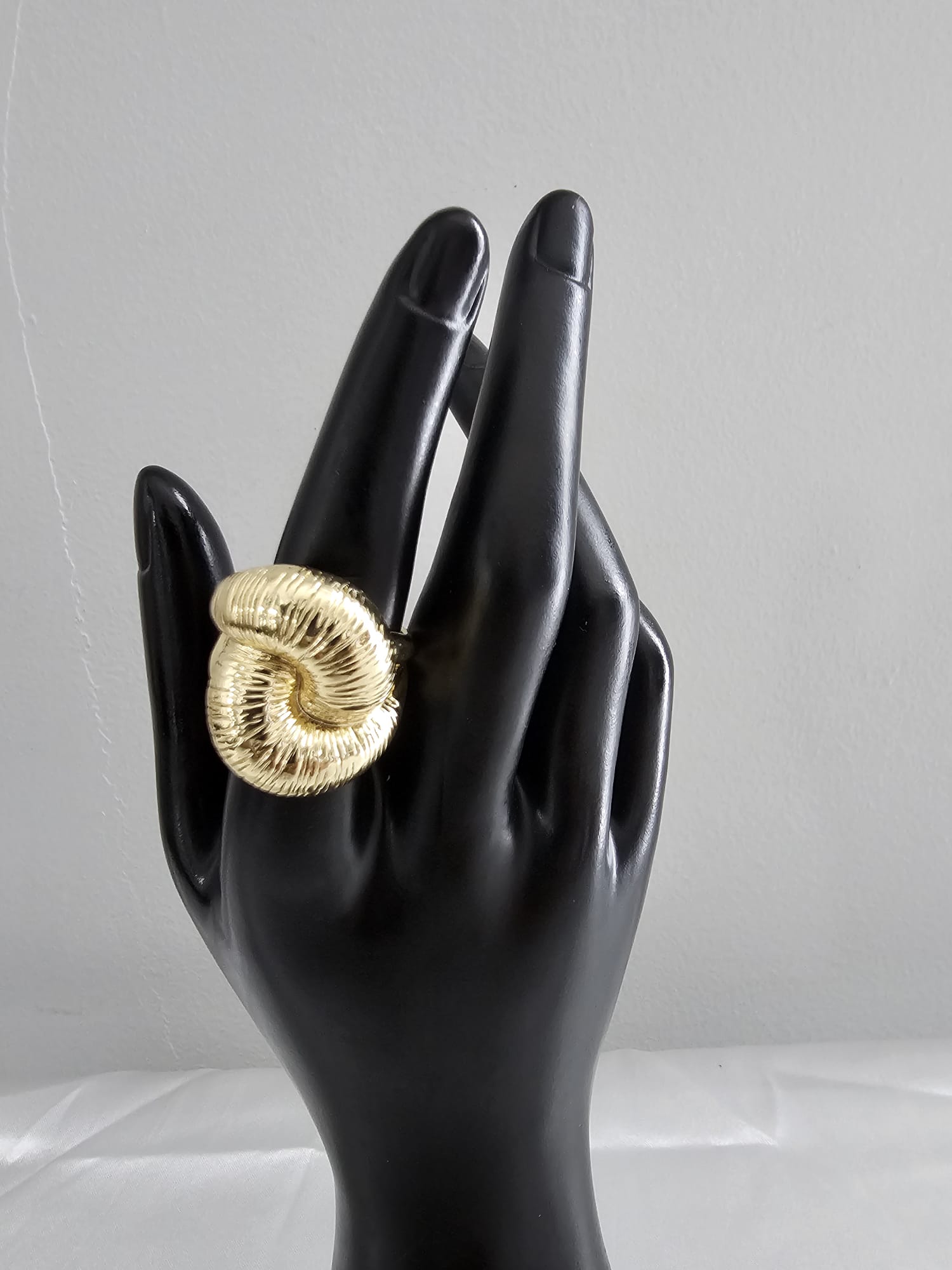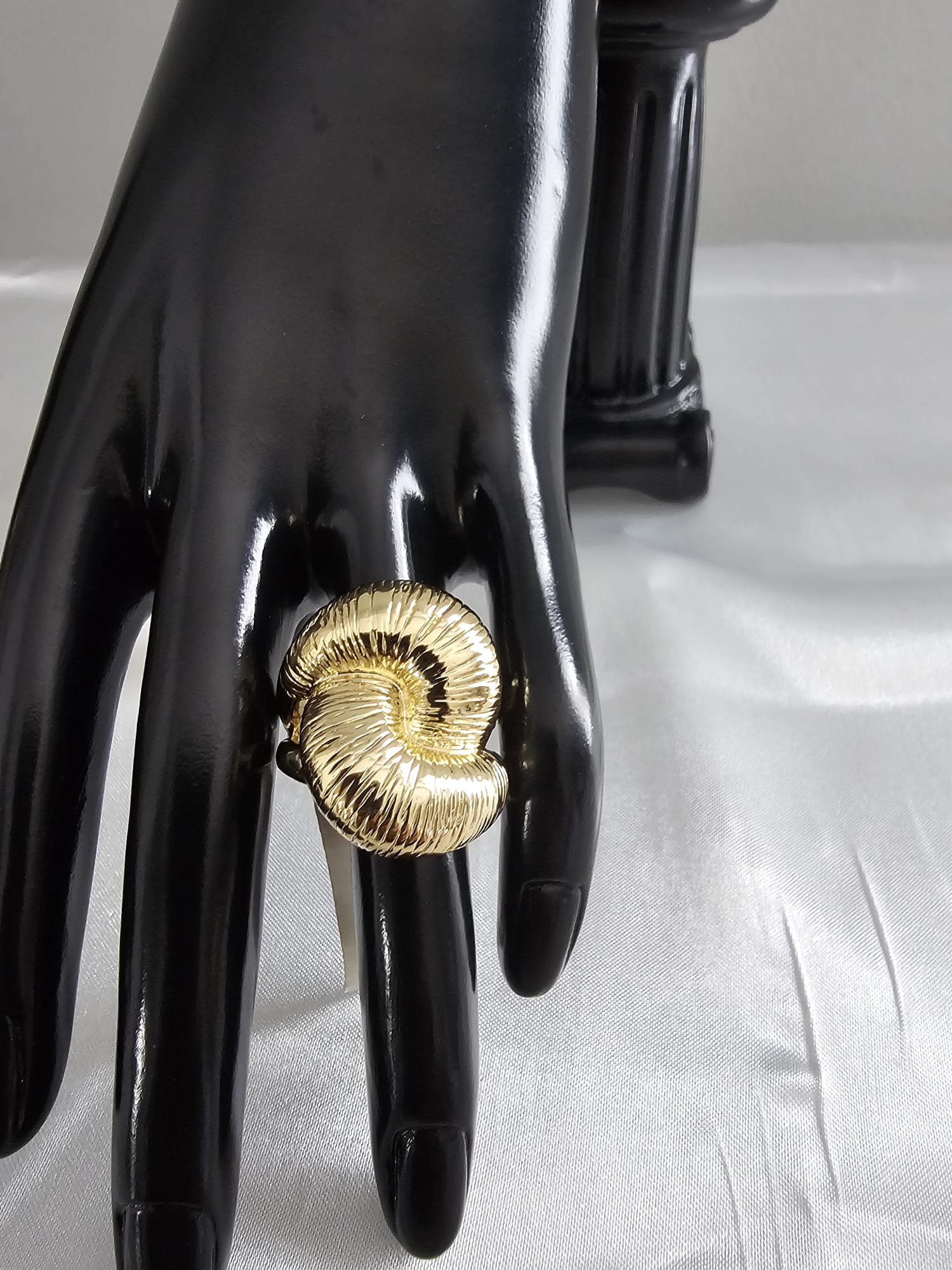 The “Golden Sunburst Ring” is a beautifully crafted piece that exudes elegance and sophistication. The ring features a prominent, circular design with textured ridges radiating from the center, creating a sunburst pattern. The central part of the design is slightly concave, enhancing the reflective quality of the gold plating.