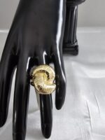 The “Golden Blossom Ring”, is a beautifully crafted piece that exudes elegance and sophistication. The ring features an intricate design with embossed details that resemble interconnected, organic shapes or blobs, giving it a unique and eye-catching appearance.