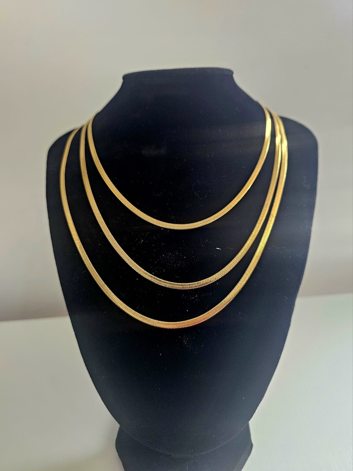 Introducing the Golden Tranquil Cascade – a luxurious gold-plated necklace that beautifully combines elegance and versatility. This striking piece features three distinct layers, each thoughtfully designed to create a graceful, cascading effect along the neckline. The shortest layer, measuring 16 inches, sits delicately at the base of the neck, while the second and third layers extend gracefully to 18 and 20 inches, respectively.