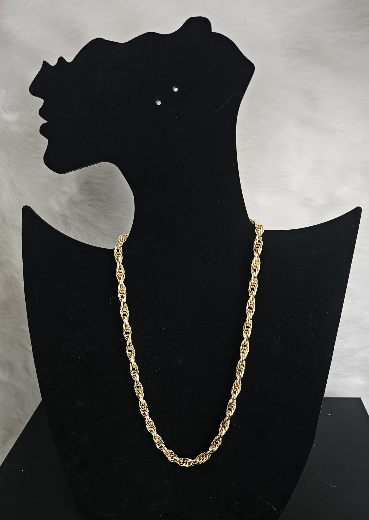 Introducing the “Golden Twisted Elegance Necklace”, a captivating piece that combines luxury with durability. This necklace features a non-tarnish gold-plated design, ensuring it maintains its radiant shine and elegance over time. The intricate twisted links create a textured appearance, adding depth and visual interest to the piece. Displayed on a black mannequin bust, the gold hue stands out brilliantly, highlighting the craftsmanship and quality of the necklace.