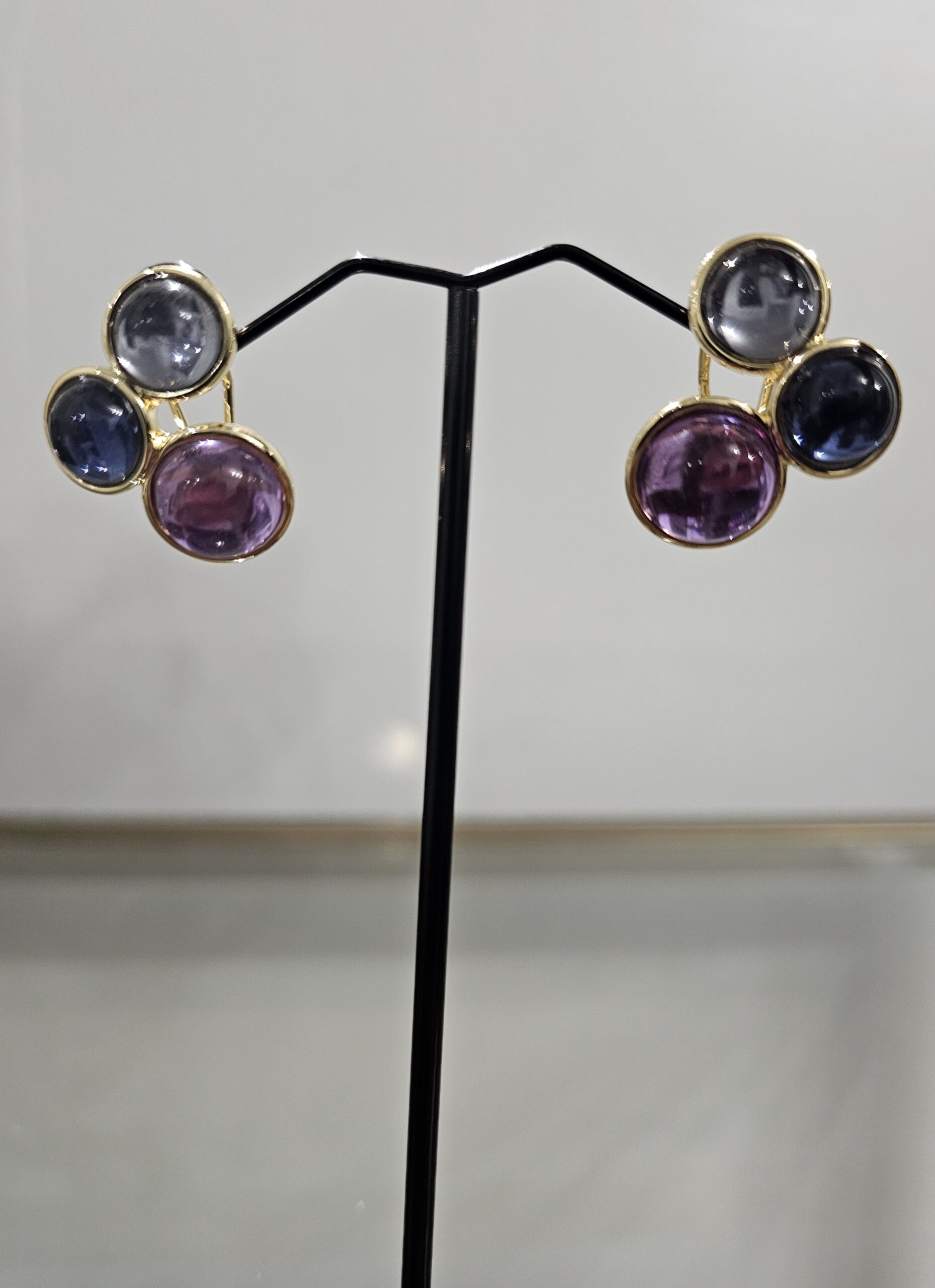 Each earring showcases three perfectly aligned spheres, each one slightly smaller than the one above, creating a harmonious and balanced design. The spheres are of similar colors, adding a cohesive and elegant touch to the overall look. The smooth, polished surface of each sphere catches and reflects light beautifully, adding a touch of sparkle to your ensemble.