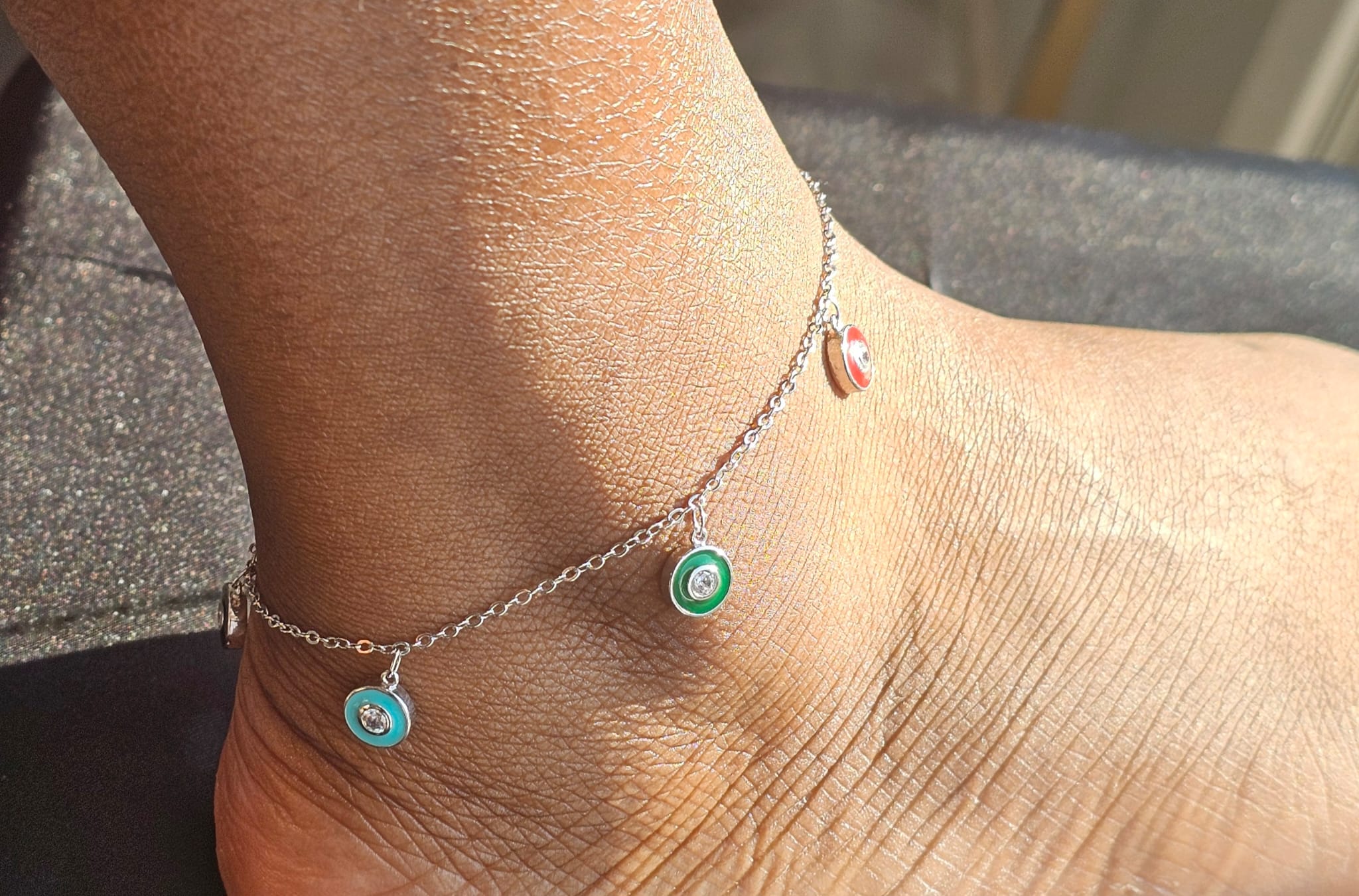 The silver chain of the anklet is non-tarnish, ensuring that it maintains its lustrous shine over time. Each pendant is evenly spaced along the chain, creating a rhythmic pattern that is both visually appealing and symbolic of unity. The red pendant represents passion and energy, the white stands for purity and peace, the green symbolizes growth and renewal, and the black signifies strength and resilience.
