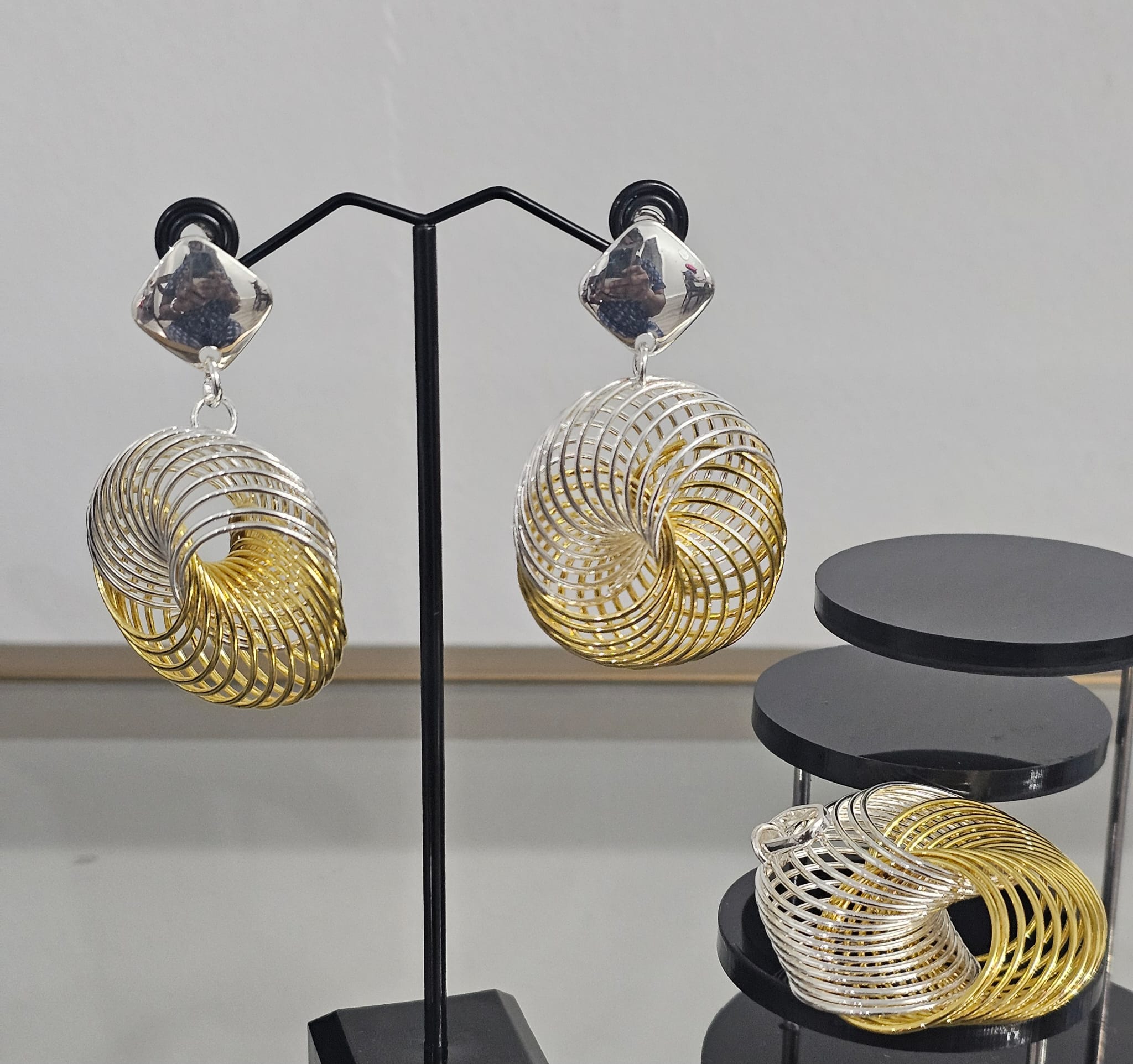 Introducing the Interwoven Circles Earring and Pendant Set, a captivating earring and pendant duo that combines the warm tones of gold and bronze in a harmonious design. This set is crafted from high-quality, gold-plated material, ensuring a non-tarnish finish that maintains its brilliance over time.