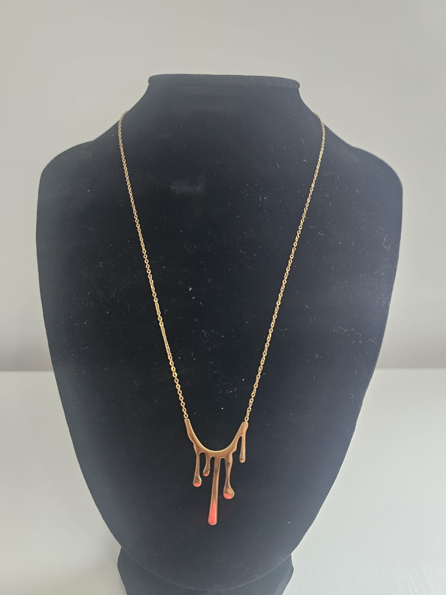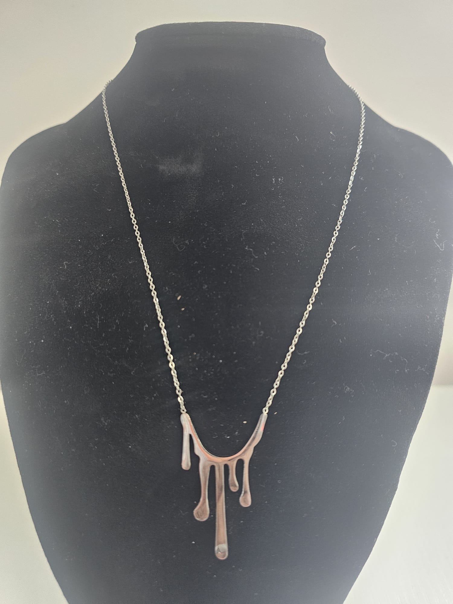 Introducing the “Liquid Embrace” Necklace – a stunning piece that embodies fluidity and modern elegance in both gold-plated and silver variations. The design of this necklace is truly unique, featuring a drip-like effect where the metal seems to cascade and flow gracefully along the neckline. At 18 inches in length, the necklace rests just above the collarbone, while a 3-inch extension allows for a customizable fit, offering the perfect length whether you’re looking to wear it close to the neck or a bit lower for a more relaxed look.