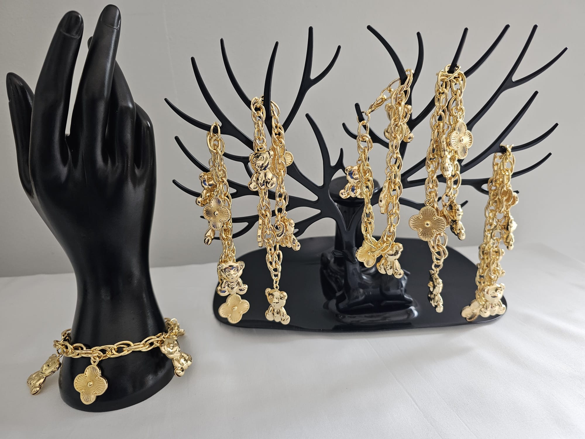 The Lucky Teddies Charm Bracelet is a delightful piece of jewelry crafted from gold-plated stainless steel. This charming bracelet features a playful mix of clover and teddy bear charms, each meticulously designed to bring a touch of cheer and good fortune to your wrist.