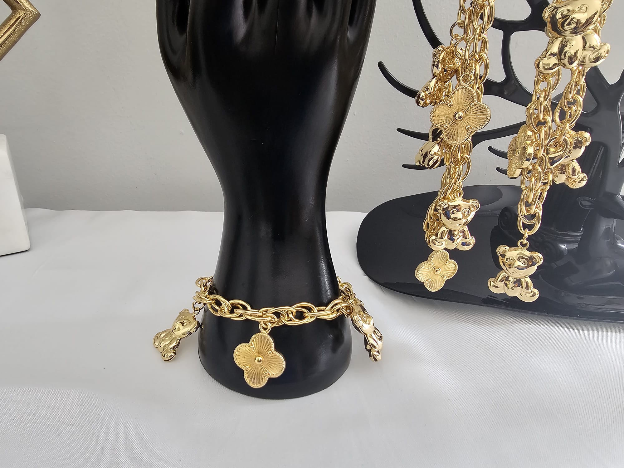 The bracelet showcases intricately detailed clover charms, symbolizing luck and prosperity, interspersed with adorable teddy bear charms that add a sweet and whimsical touch. This combination creates a fun and stylish accessory, perfect for everyday wear or for adding a touch of whimsy to special occasions.