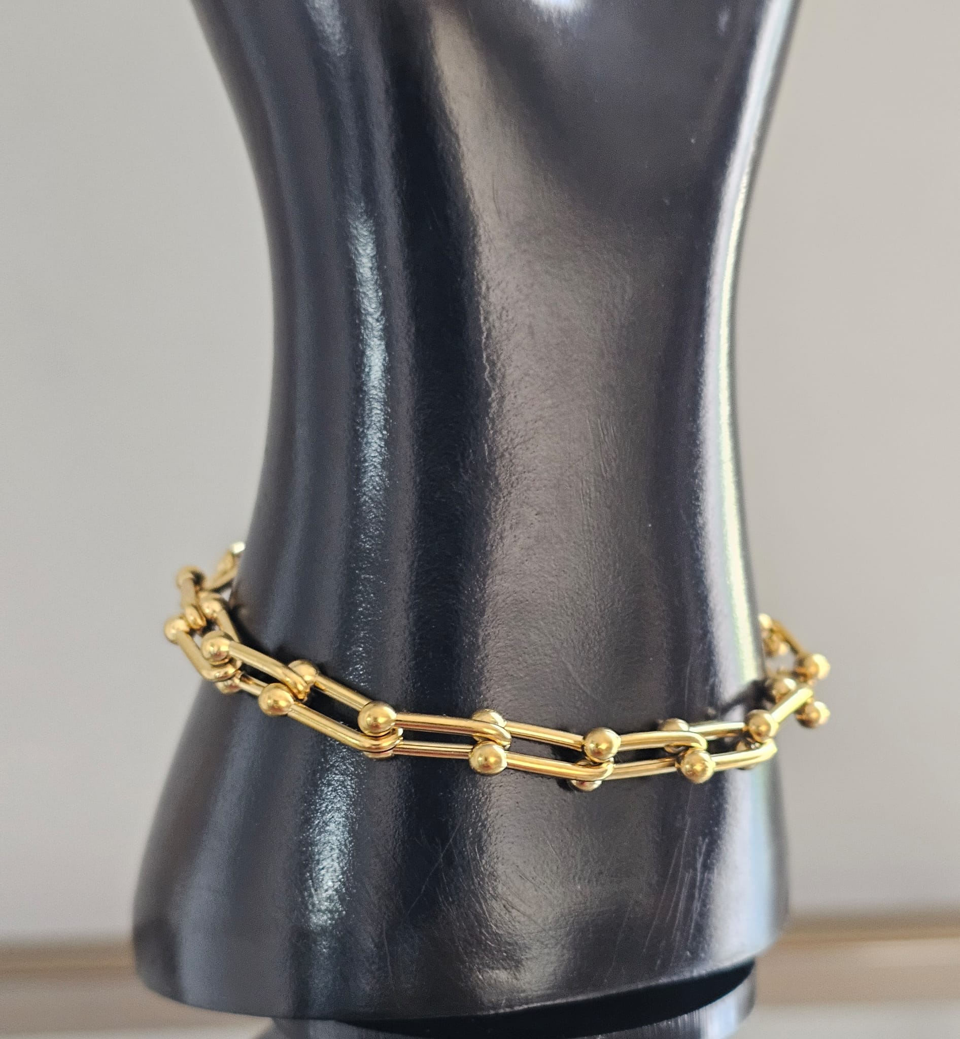 This bracelet features a sleek, polished chain with small, evenly spaced spherical beads, or “balls,” that orbit around it. The beads are often made from materials like gold plated stainless steel adding a touch of elegance. The design combines the classic allure of a chain bracelet with the playful and dynamic element of the floating orbs, creating a stylish piece that catches the light and adds a touch of sophistication to any outfit.