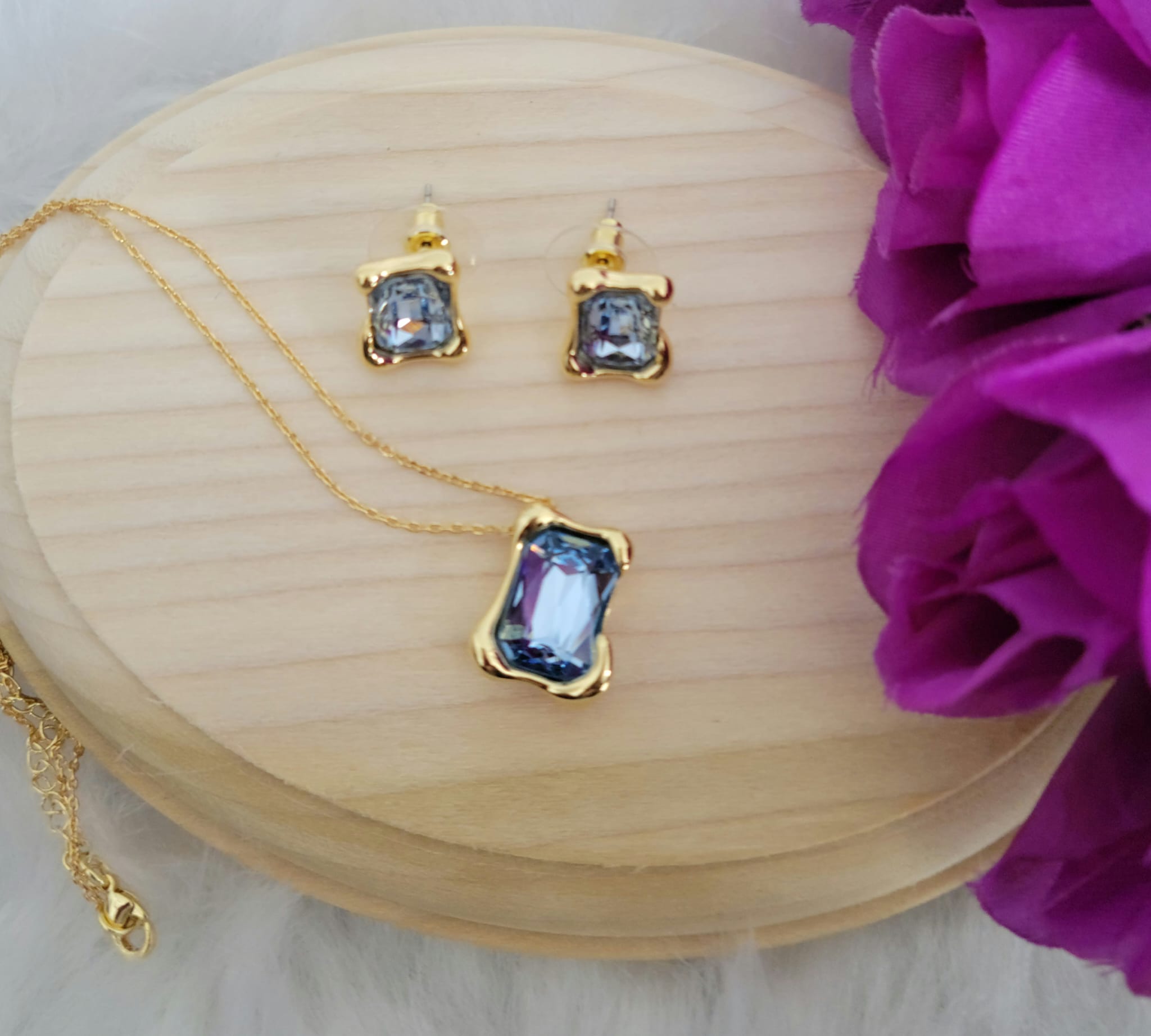 The pendant hangs gracefully from a fine gold chain, which highlights the rectangular gem without overshadowing it. The necklace’s simplicity complements the opulent design of the pendant, making it a versatile accessory suitable for both formal and casual occasions. The Luxe Rectangle set is designed to provide a sophisticated and timeless look, making it a perfect addition to any jewelry collection.