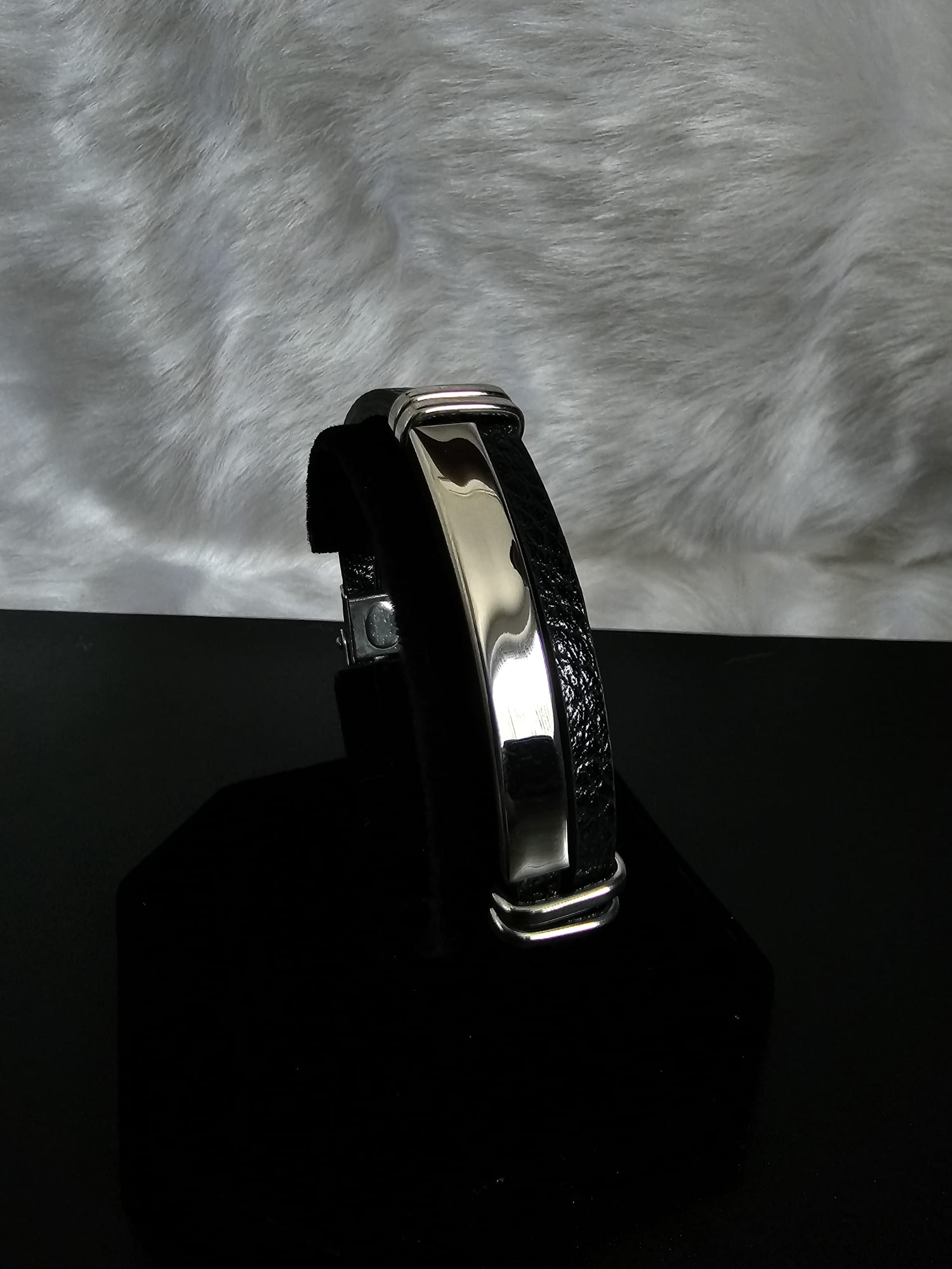 The Midnight Edge Bracelet is a sophisticated unisex accessory designed to blend sleek black leather with a touch of polished silver. This bracelet features a wide, smooth black leather band that wraps comfortably around the wrist, offering a classic yet modern look.