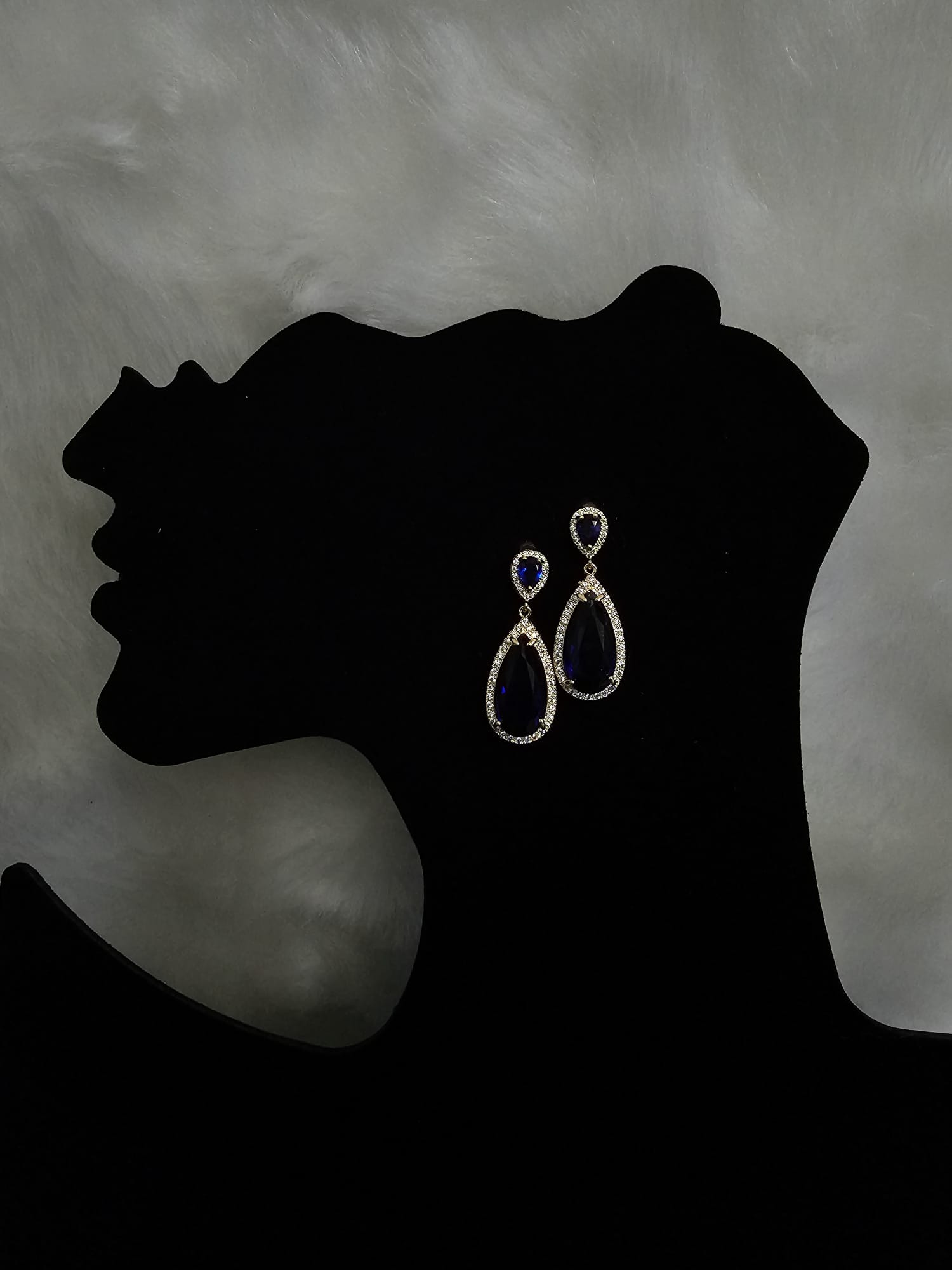 The design of Midnight Elegance is both classic and modern, making it a versatile accessory that can complement any outfit. Whether you’re dressing up for a special occasion or adding a touch of sophistication to your everyday look, these earrings are sure to make a statement. The deep blue of the teardrop gemstones evokes the serene beauty of a midnight sky, while the gold-plated setting adds a touch of warmth and luxury.