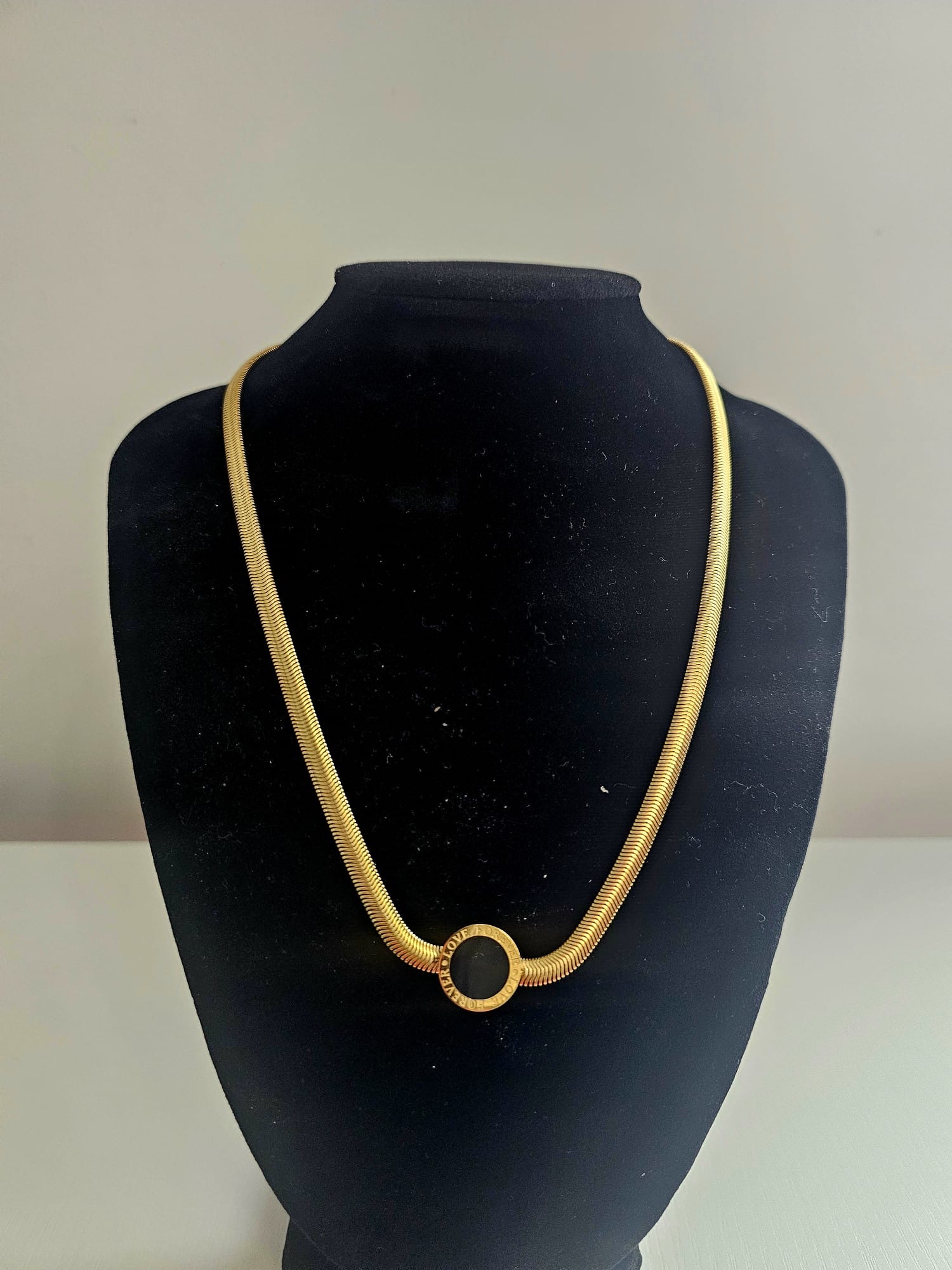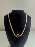 The “Midnight Majesty” necklace is designed to make a striking impression with its substantial thickness and the deep allure of the central black stone. Whether in gold or silver, the bold contrast between the shiny metal and the dark stone creates a captivating focal point that draws attention, yet remains refined. The necklace’s solid construction and distinctive design make it perfect for those who appreciate statement jewelry with a luxurious, modern edge.