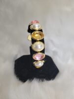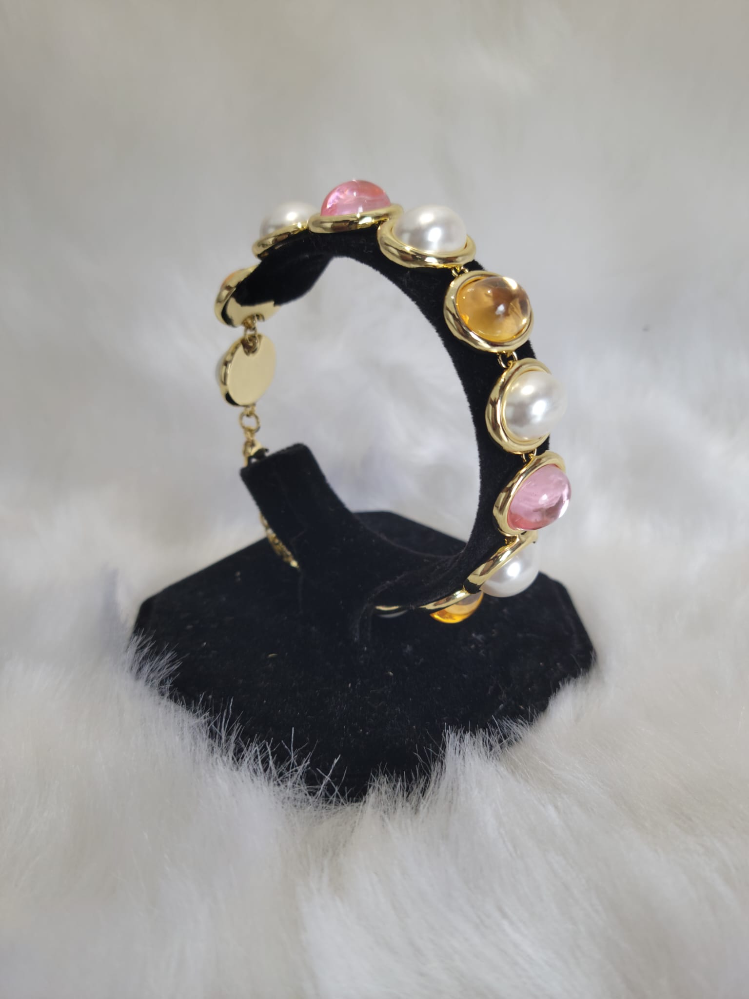 The design alternates between lustrous faux pearls and brilliant, colorful faux gemstones. Each oval encasing the faux pearls provides a smooth, classic look that contrasts beautifully with the vivid, multifaceted faux gemstones. The gemstones come in an array of rich, vibrant colors, adding a playful and dynamic touch to the bracelet.
