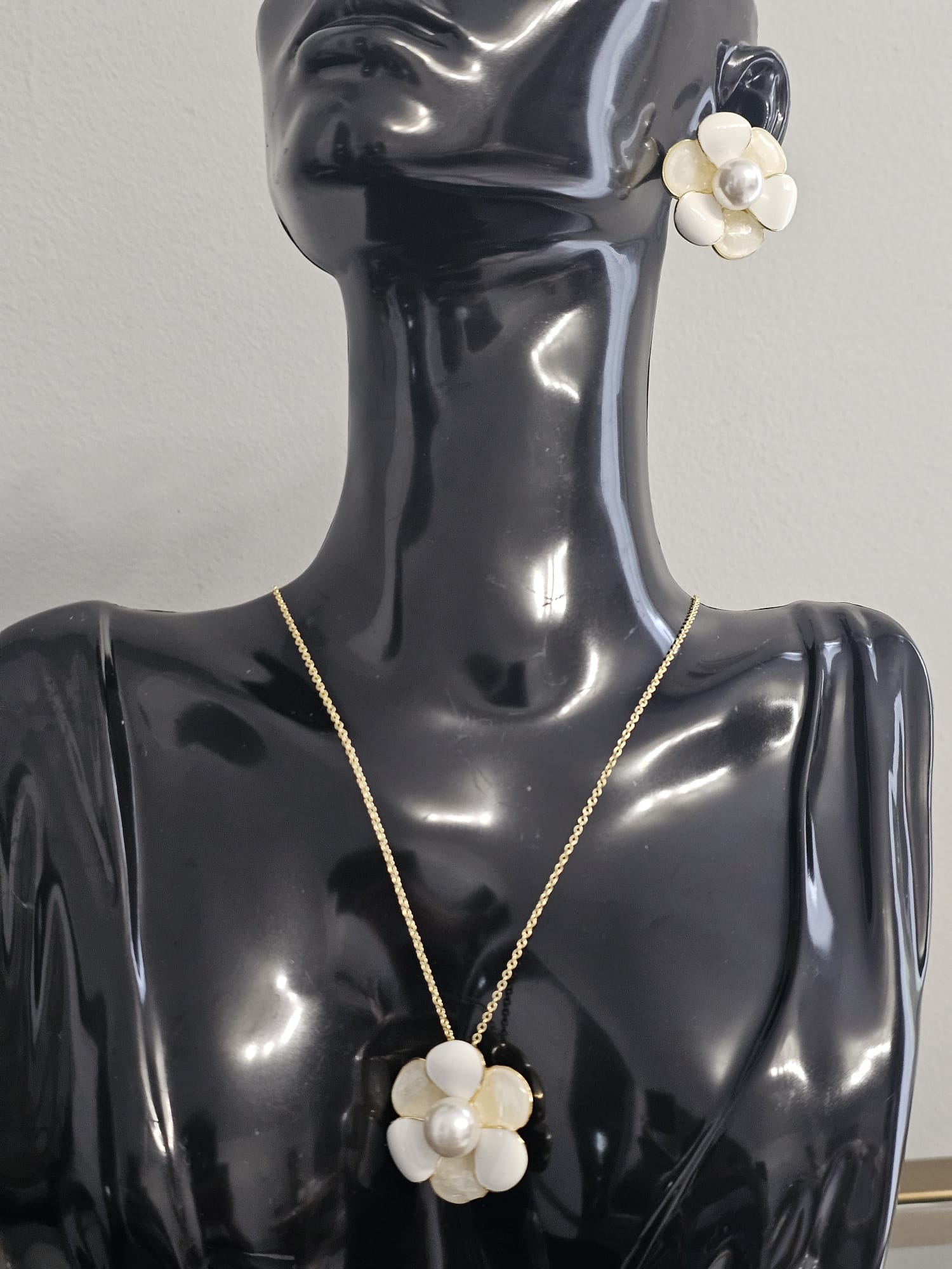 The Pearl Blossom Set”is a beautifully crafted jewelry ensemble that exudes timeless elegance and delicate charm. This set features a necklace and matching earrings, both designed to resemble a pristine white flower with a lustrous faux pearl at its center. The entire set is made with meticulous attention to detail, combining classic motifs with contemporary materials.