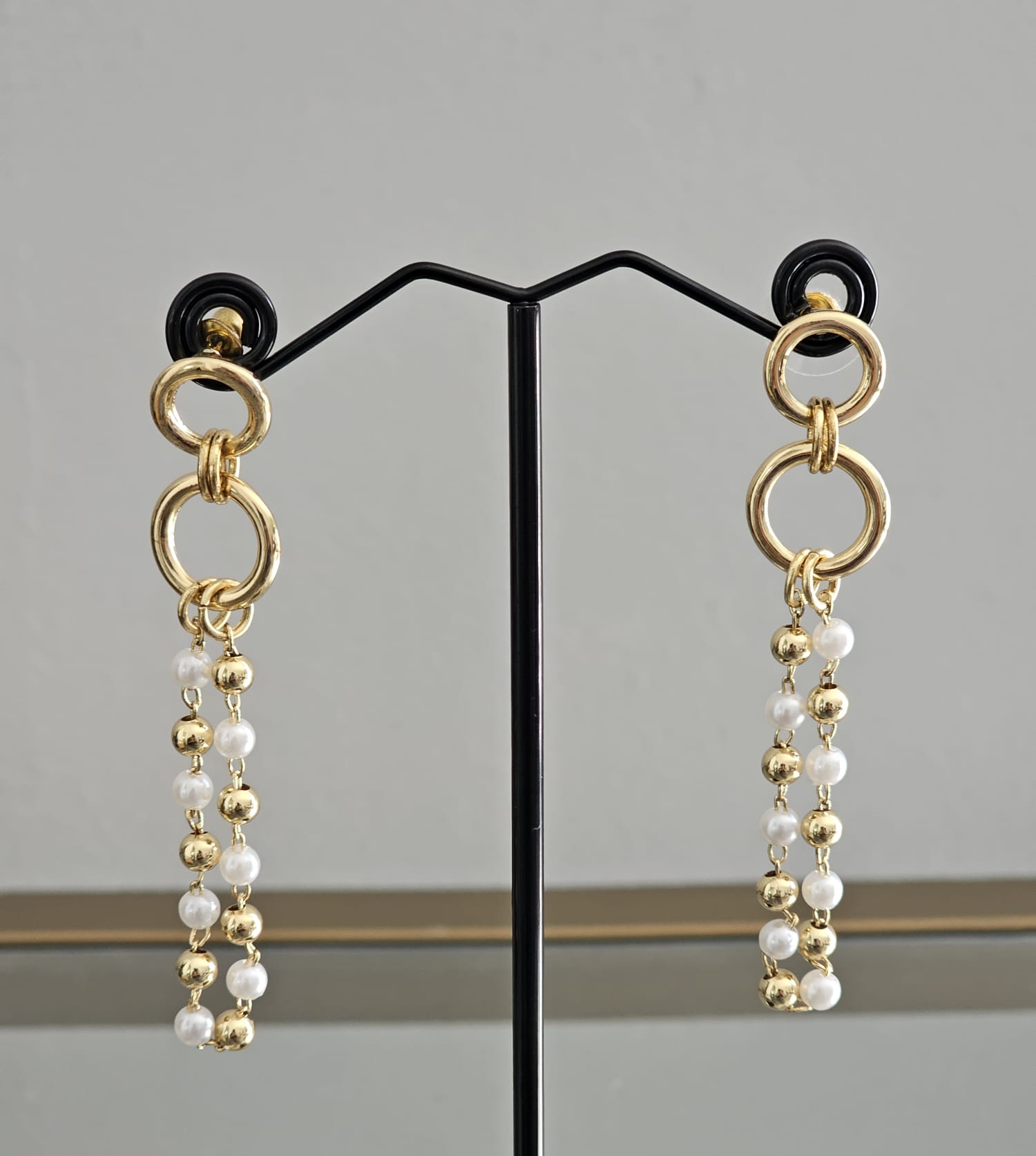 Introducing the Pearl Elegance Dangling earrings, a stunning combination of classic beauty and modern sophistication. The design features a series of delicate gold chains, each adorned with alternating gold and white pearls.