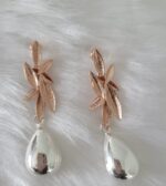 Suspended from the petals is a silver teardrop, creating a stunning contrast that enhances the overall allure of the piece. The teardrop is polished to a mirror-like finish, reflecting light and adding a touch of elegance to the design. The combination of the warm gold/bronze and cool silver tones makes Petal Dewdrop a versatile accessory, perfect for both formal occasions and everyday wear.