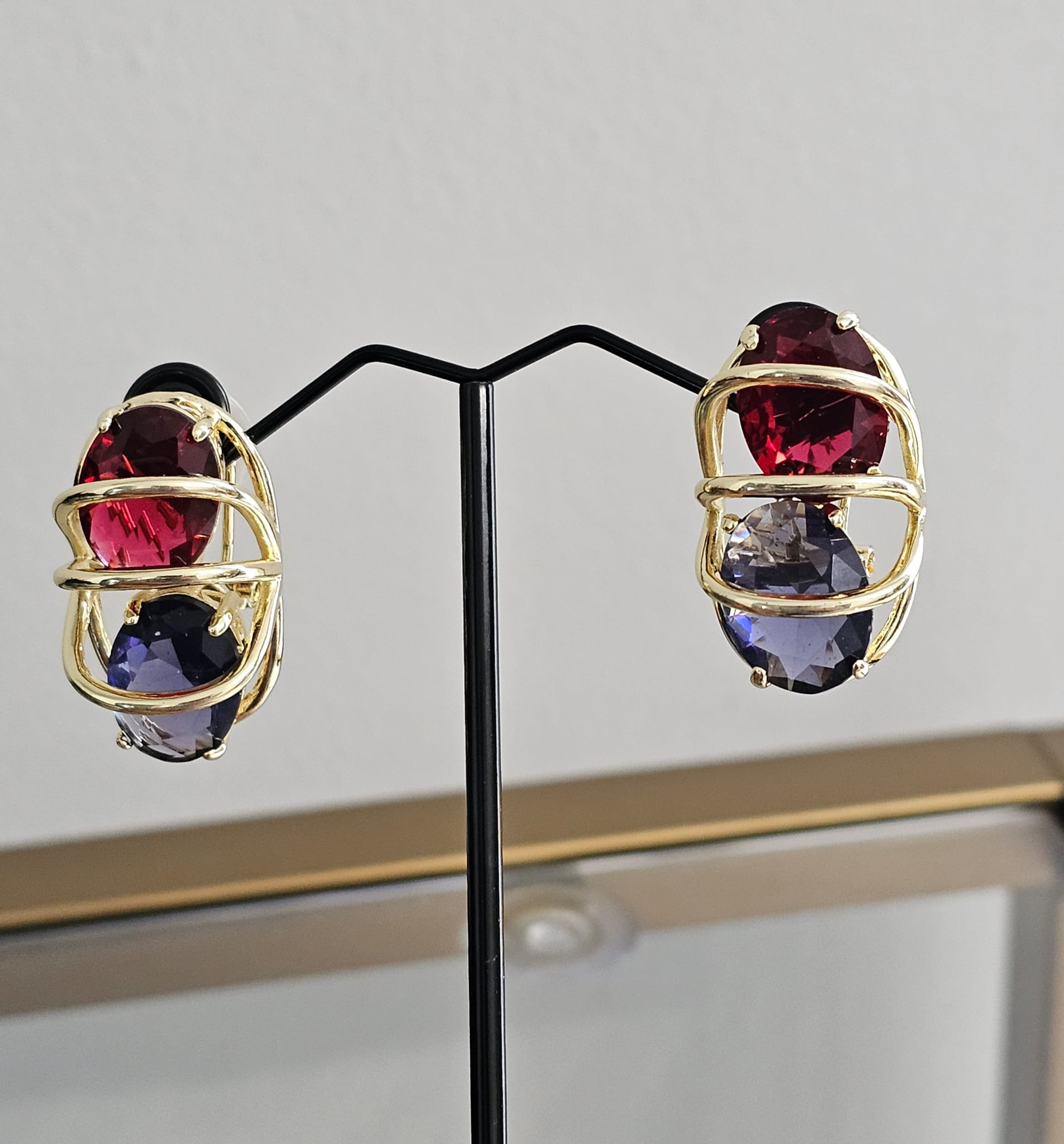 The combination of red and blue gemstones, framed by the warm glow of gold, creates a harmonious and eye-catching design. The Royal Duo earrings are perfect for those who appreciate bold and elegant jewelry, offering a sophisticated accessory that can elevate any outfit, from casual to formal. These earrings are designed to make a statement, ad