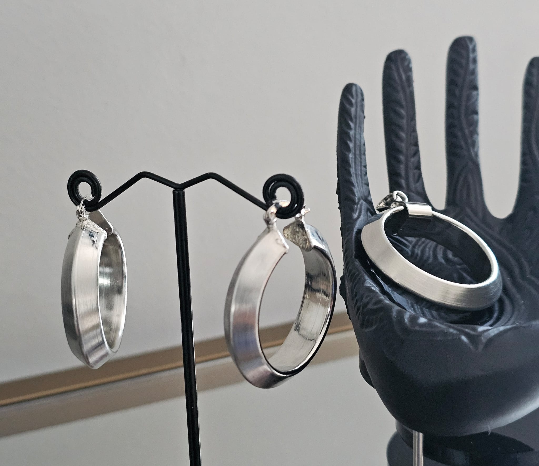 The earrings are designed as sleek hoops, featuring a smooth, polished finish that catches the light beautifully. These hoops are lightweight and comfortable, with a secure latch-back closure that ensures they stay in place throughout the day. The minimalist design makes them versatile enough to complement any outfit, from casual daywear to elegant evening attire.