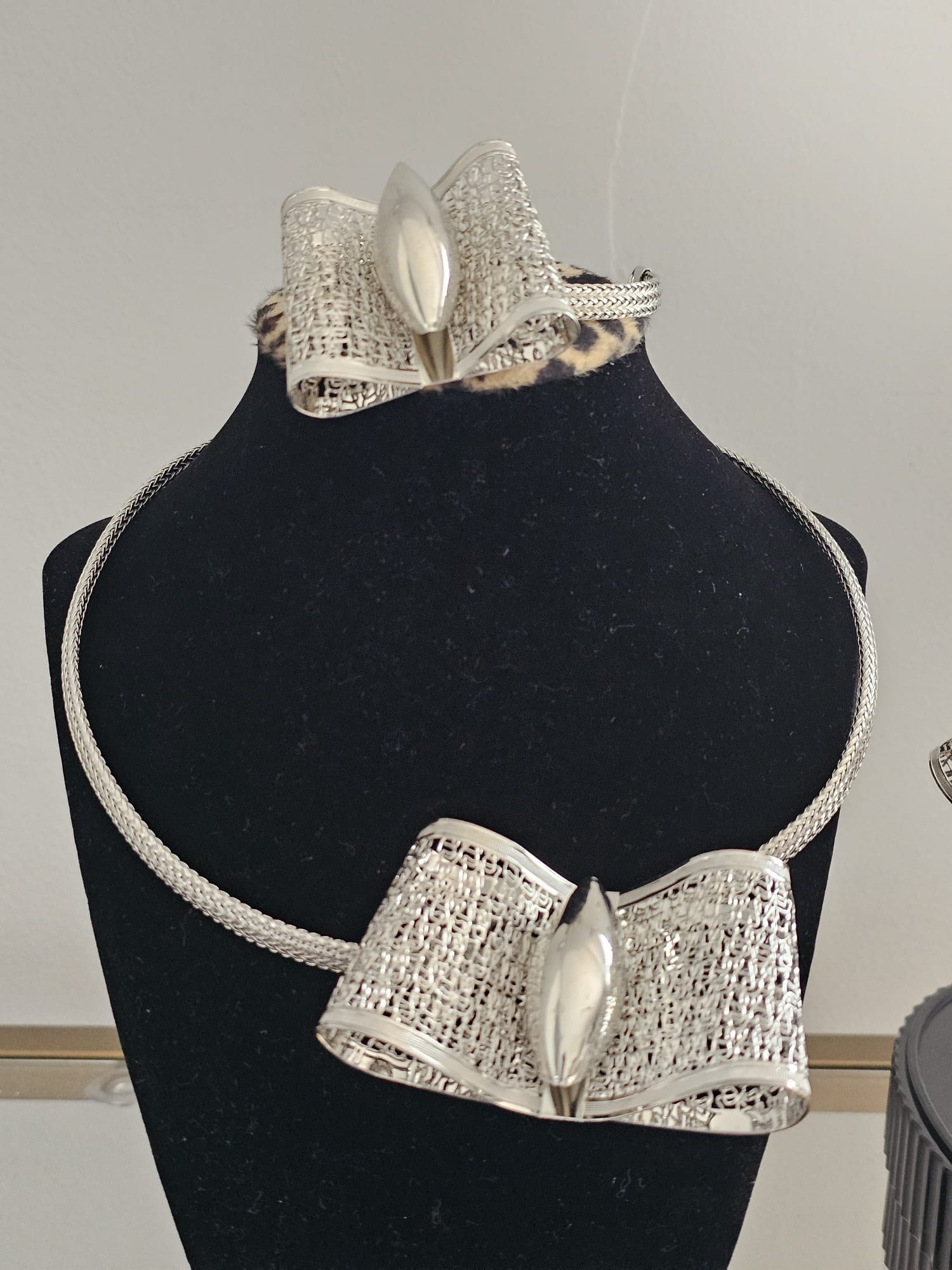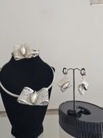 The Silver Mesh Bow Collection is a refined and elegant three-piece jewelry set crafted from high-quality silver-plated stainless steel. This collection includes a necklace, bracelet, and earrings, each adorned with a distinctive silver metal net bow design that exudes sophistication and charm.