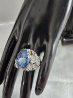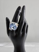 The silver setting provides a striking contrast to the vibrant blue of the central stone, enhancing its brilliance and making it the focal point of the ring. The smaller gemstones add a touch of sparkle, further elevating the ring’s luxurious appeal. The detailed craftsmanship and high-quality materials ensure that this ring is not only stunning but also durable and long-lasting.