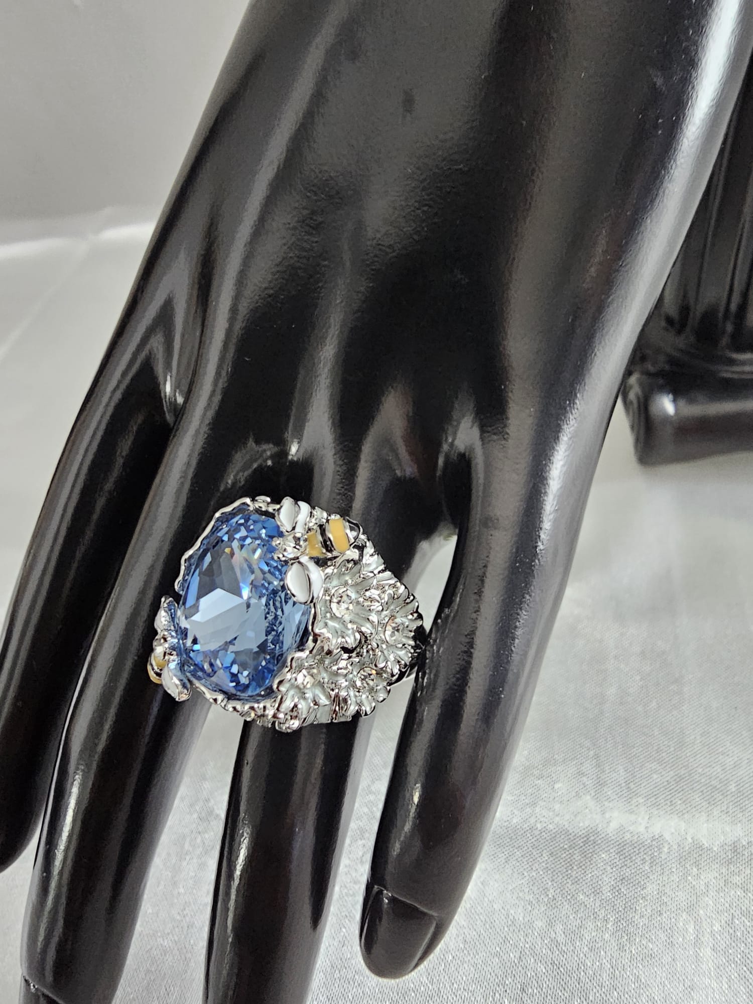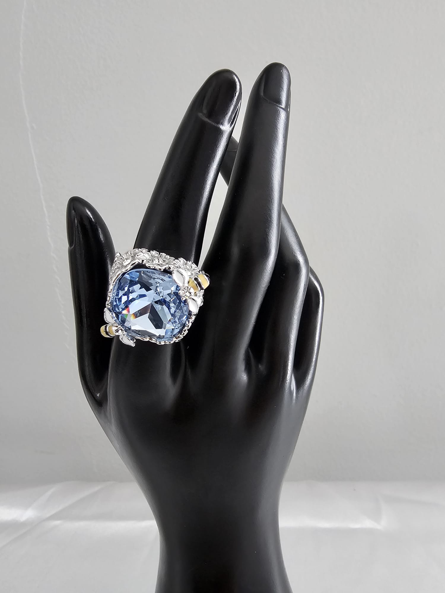 The “Silver Royalty Ring”, is a beautifully crafted piece that exudes elegance and sophistication. It features a large, central blue gemstone, likely a sapphire, surrounded by smaller clear and yellow gemstones, in the shape of a bee. The intricate metalwork on the band and setting includes patterns that resemble leaves or floral motifs, adding to the ring’s ornate and regal appearance.