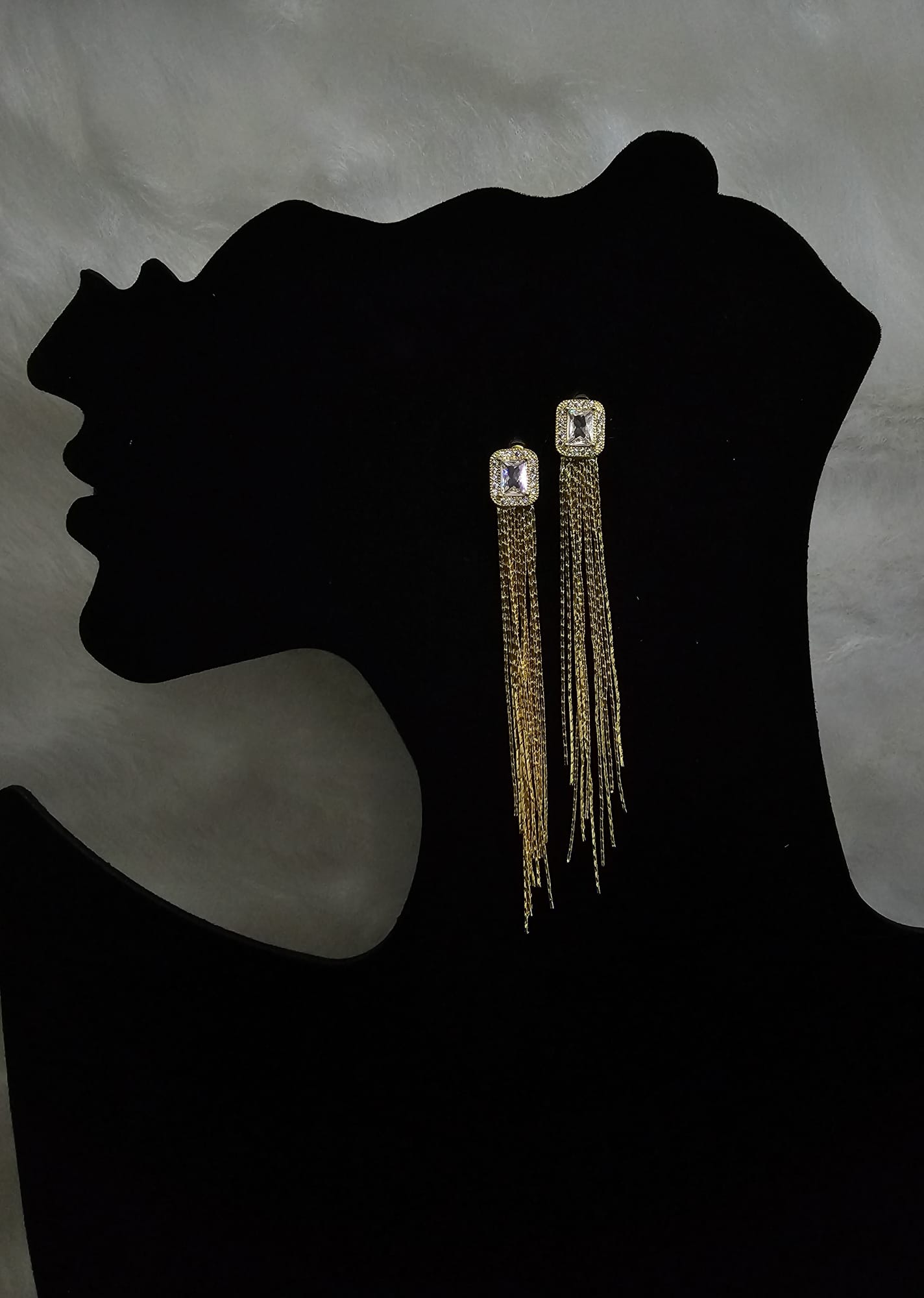 At the top of each earring sits a dazzling sparkling stone, carefully selected for its brilliance and clarity. This stone catches and reflects light beautifully, adding a touch of glamour to your look. Suspended below the sparkling stone are delicate gold strands, creating a graceful and flowing design. The strands add movement and elegance, making these earrings perfect for any occasion.