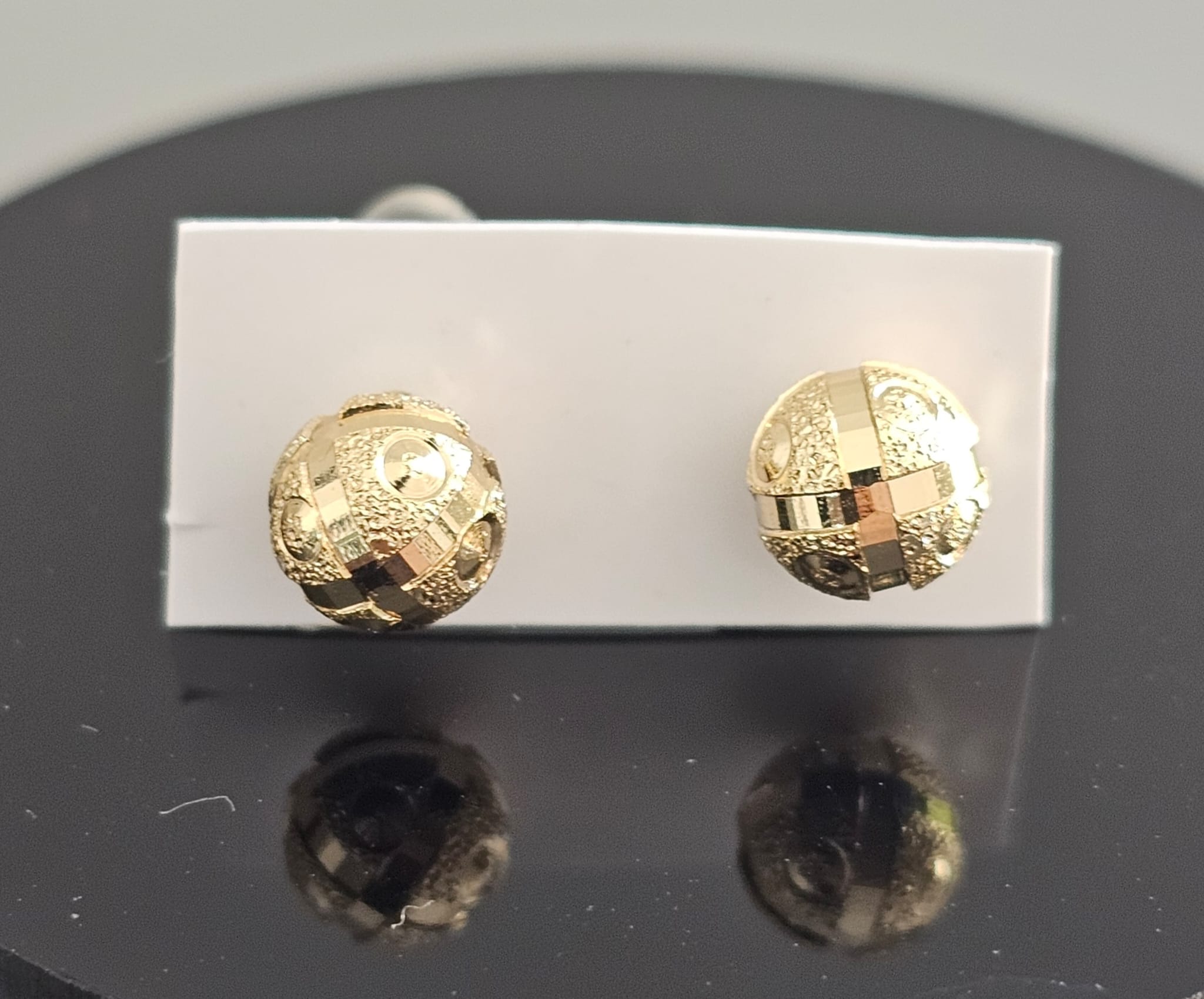 The textured design of these studs adds depth and visual interest, creating a sophisticated and unique look. The surface of the earrings is intricately detailed with a pattern that catches and reflects light beautifully. This texture is combined with tiny, shimmering particles or crystals embedded within the design, adding a touch of sparkle and brilliance. The result is a pair of earrings that glisten with every movement, making them ideal for both casual and formal occasions.