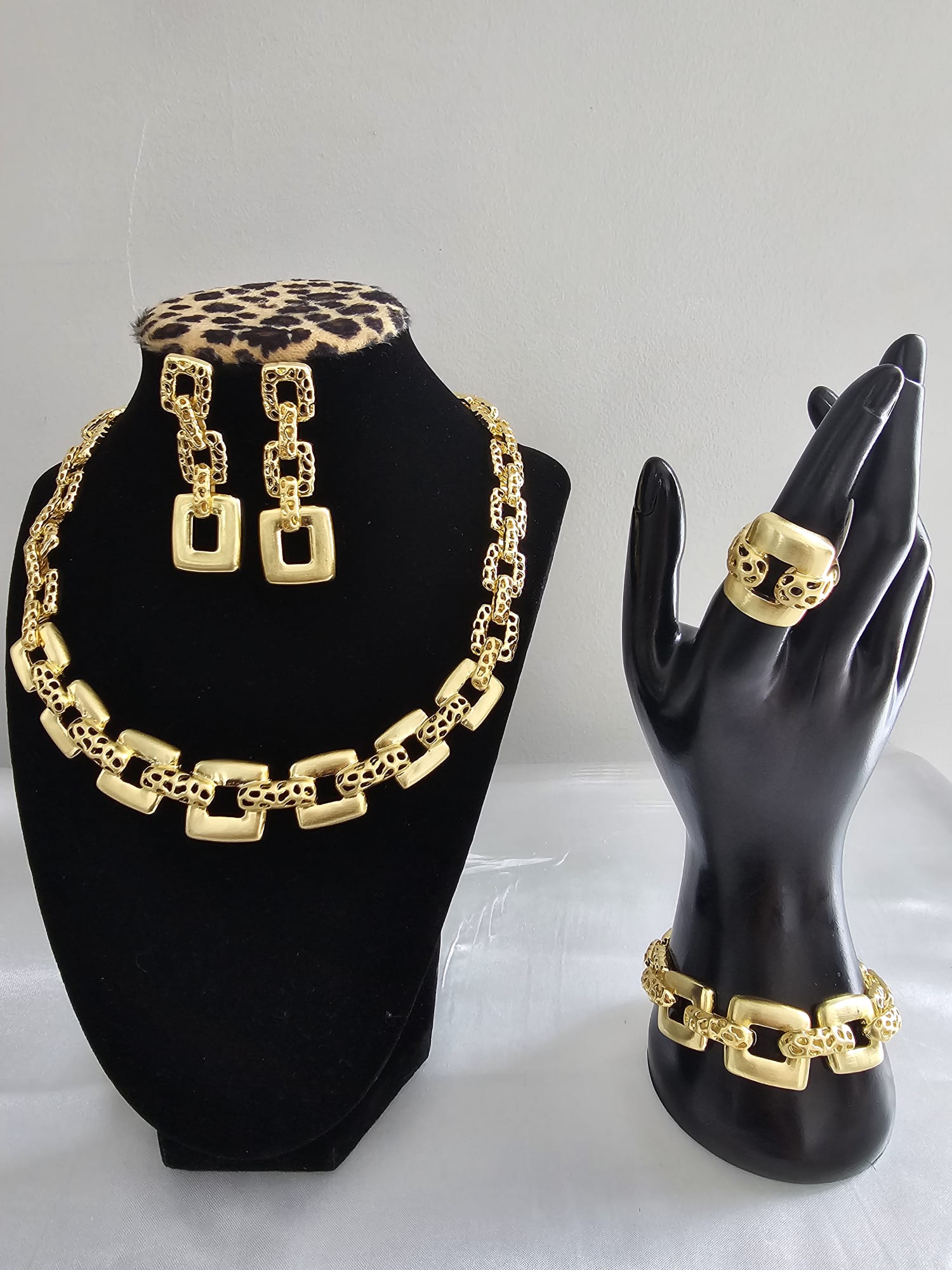 The Square Radiance Ensemble is a sophisticated four-piece jewelry set crafted from high-quality stainless steel. This set includes a necklace, bracelet, ring, and earrings, each adorned with a distinctive square design and textured details, creating a cohesive and elegant look. The set features a geometric square motif, with each piece incorporating squares in various arrangements. The texture adds depth and visual interest, creating a modern and refined aesthetic.