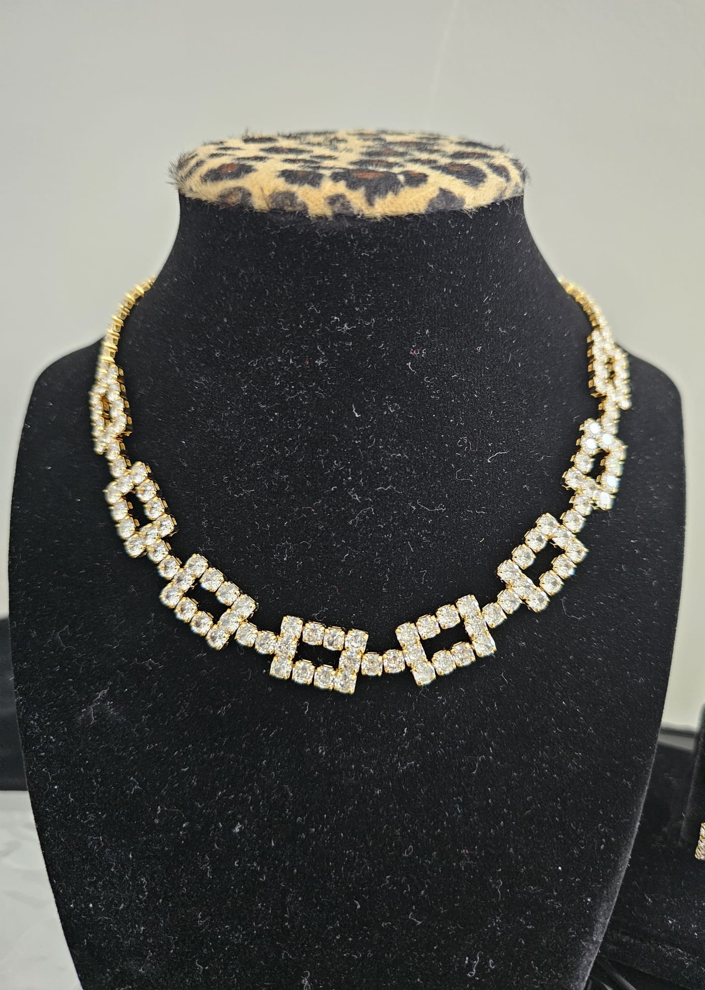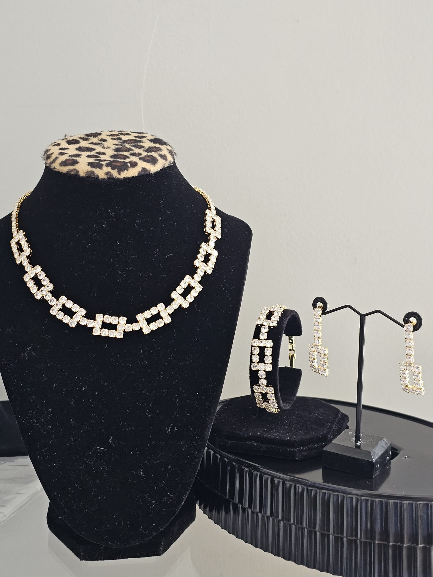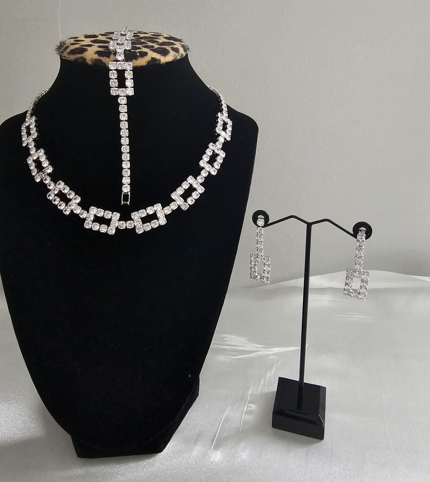 The Square Sophistication Trio is an elegant jewelry set crafted from stainless steel and adorned with faux diamonds, designed to offer a chic and modern aesthetic. This trio includes a necklace, bracelet, and earrings, each featuring distinctive square elements for a cohesive and stylish look.