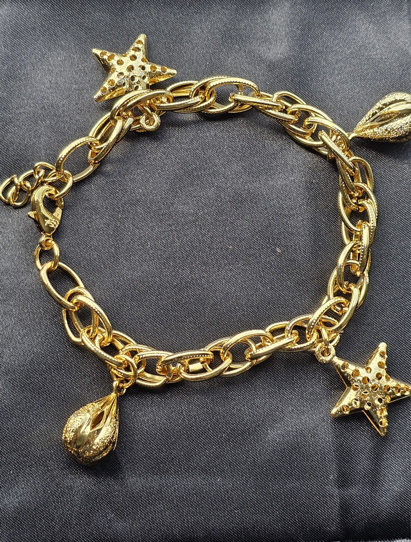 The stars, gleaming with a polished gold finish, add a touch of celestial magic to the bracelet. Each star charm is intricately detailed, catching and reflecting light beautifully. Interspersed among the stars are teardrop-shaped charms, which have a smooth, rounded profile and also feature the radiant gold plating. These teardrops create a graceful contrast with the stars, adding a sense of flowing elegance.