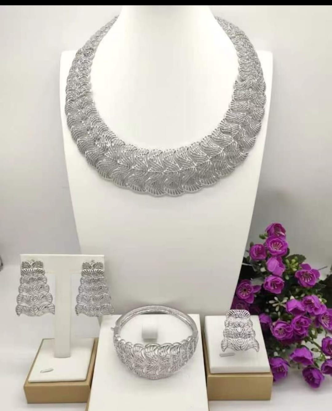 The Sylvan Elegance Set is a beautifully crafted jewelry collection that includes a necklace, earrings, and a bracelet, all made from high-quality, non-tarnish silver. The necklace features a series of intricately linked leaf-shaped elements with detailed vein-like textures, forming an elegant collar. The earrings mirror this design with vertically hanging leaves, creating a striking drop effect, while the bracelet continues the motif with connected leaves forming a wide band. This set captures the essence of nature’s beauty, offering a sophisticated and organic look suitable for any occasion, and its non-tarnish silver ensures lasting shine and durability.
