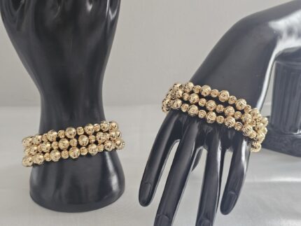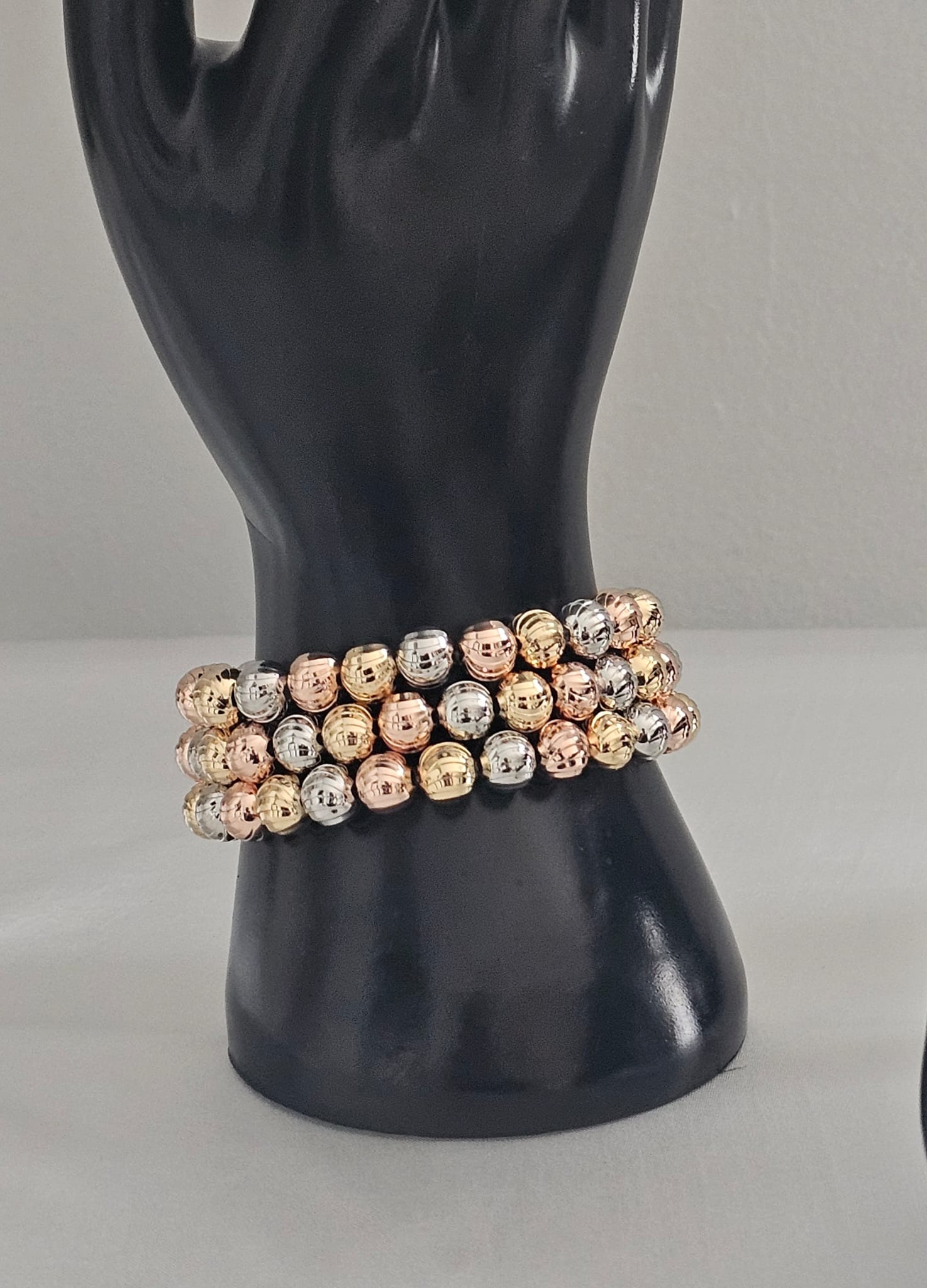 The Textured Harmony Trio offers a sophisticated and versatile design with its alternating gold, bronze, and silver beads, each with a touch of texture. The gold-plated stainless steel construction provides both elegance and durability, making this set perfect for enhancing any outfit. Whether worn individually for a subtle touch of sophistication or stacked together for a more dramatic effect, this trio adds a refined and stylish element to your jewelry collection. The beads are strung on a durable and flexible elastic band, providing a comfortable and adjustable fit. The elasticity accommodates various wrist sizes and ensures ease of wear.